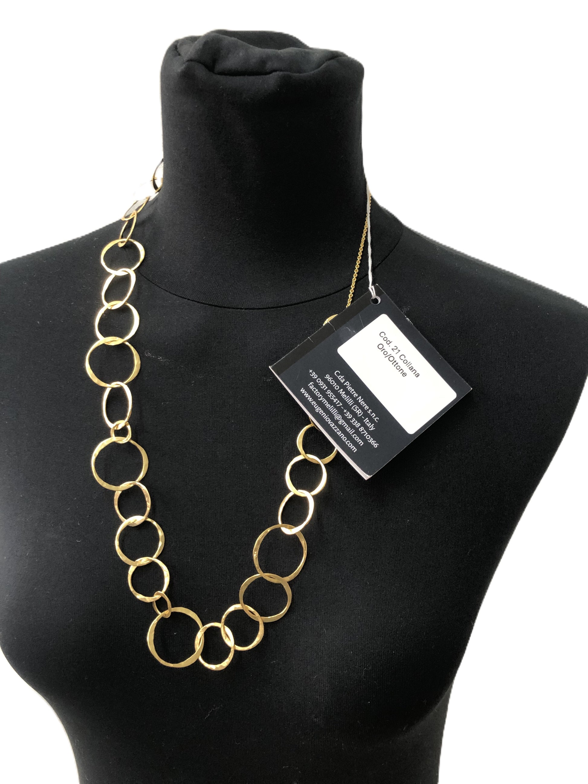 Circled it's a handcrafted necklace in gold plated brass.