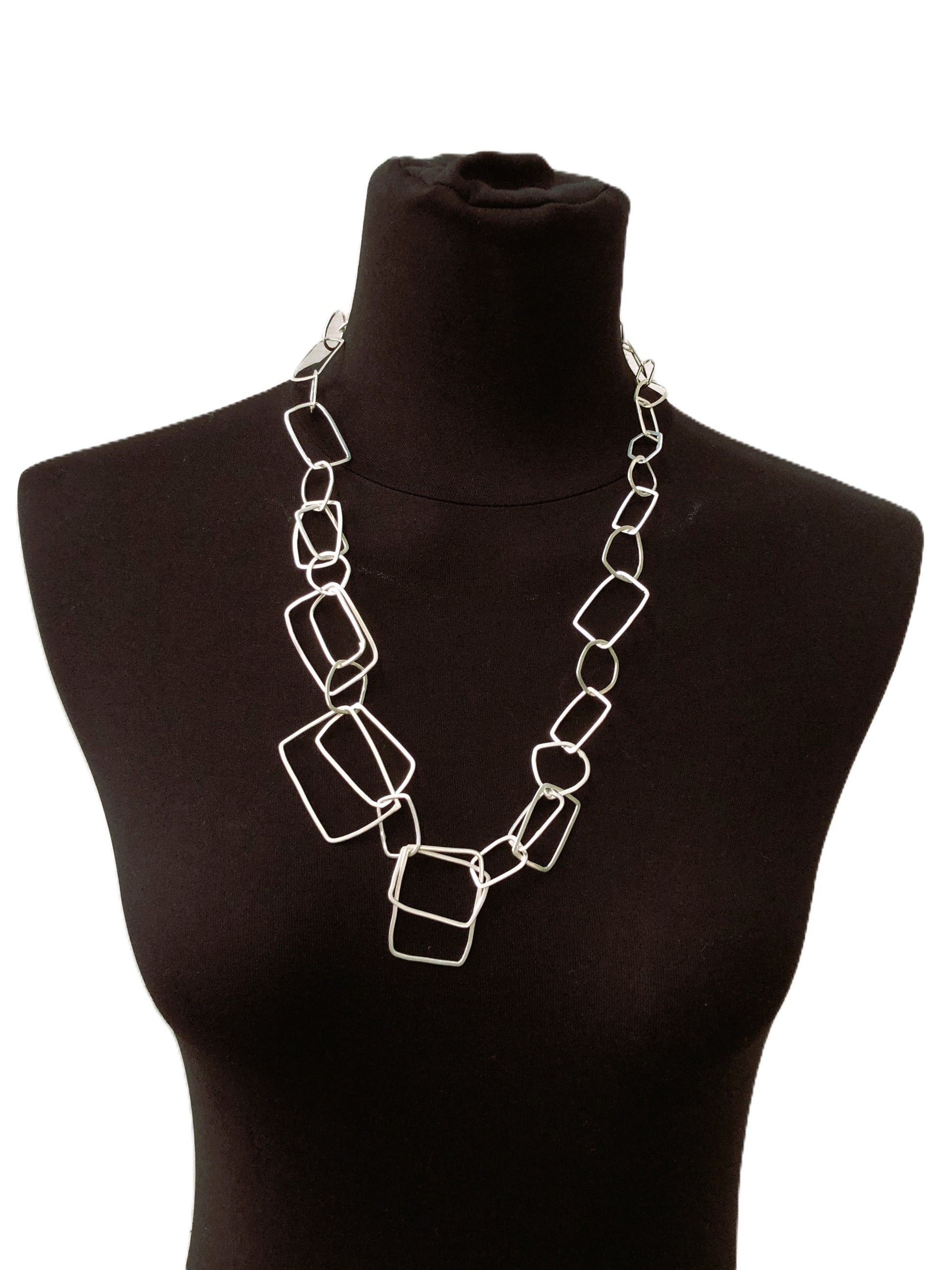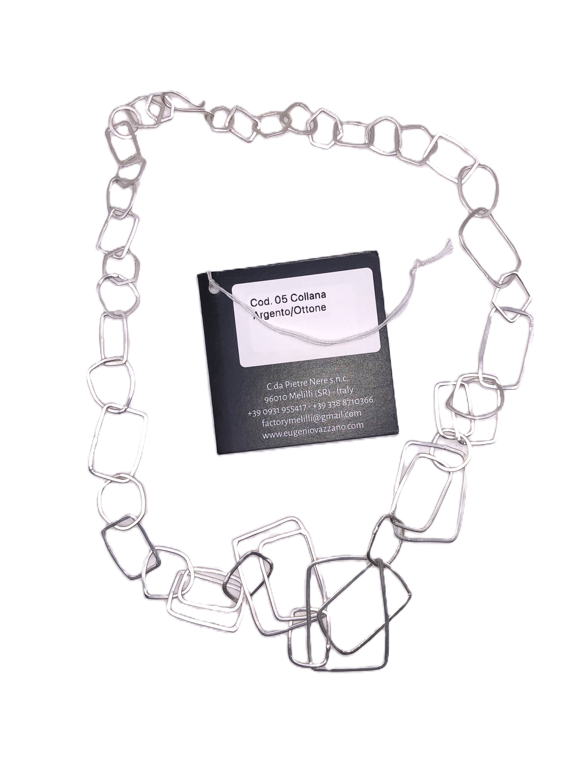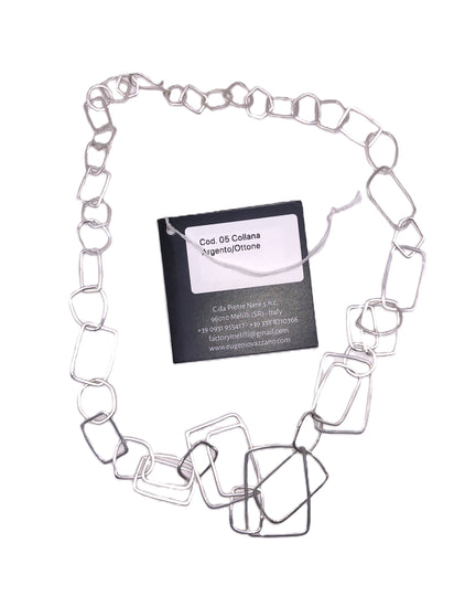 Rectangle it's a handcrafted necklace in silver-plated brass. The necklace Rectangle is accompanied by a elegant storage bag, made handcrafted with fine fabrics, perfect for protecting and carefully preserving your new jewel.