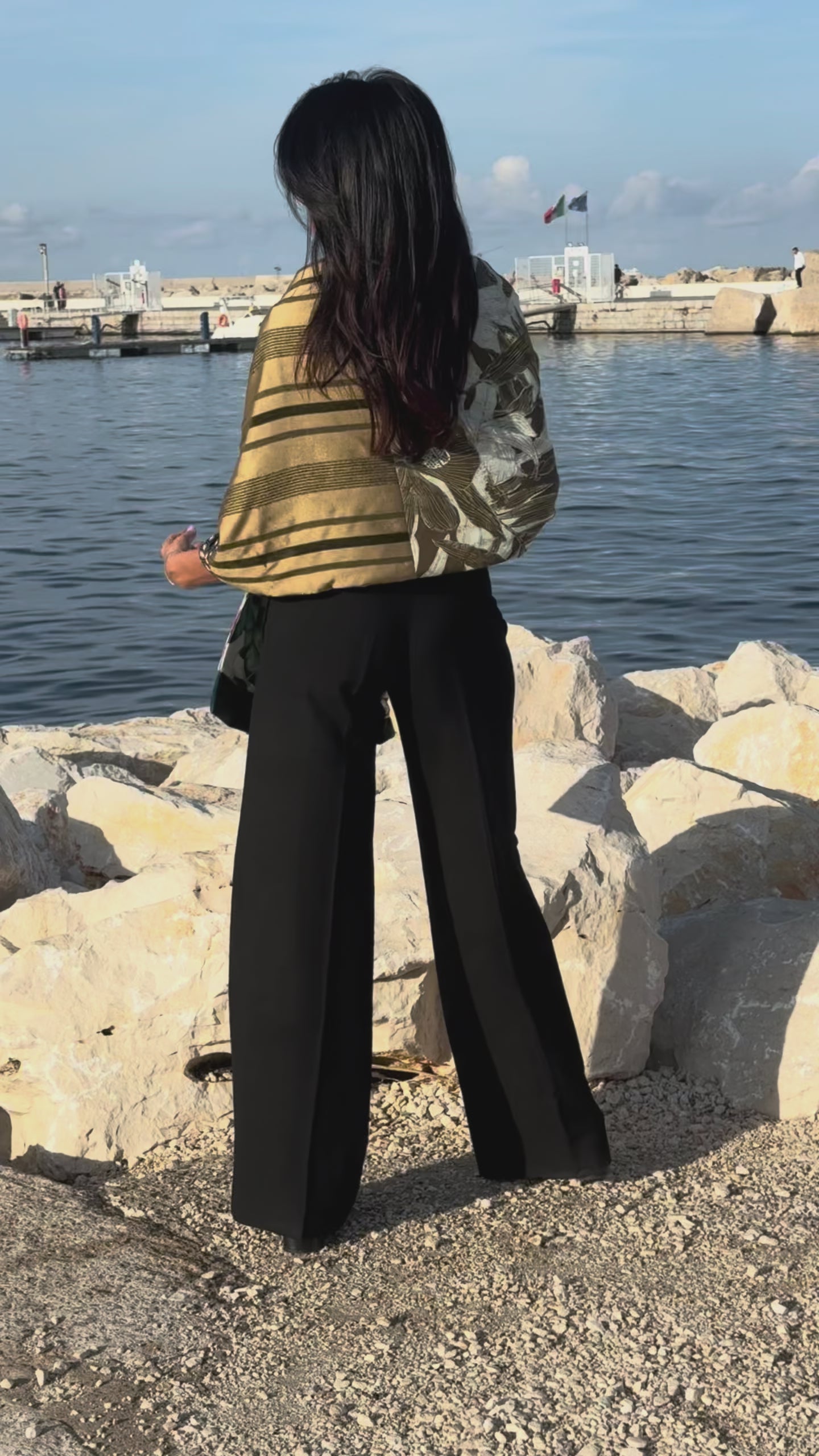If you want a more “modern” effect, use it closed with the buttonhole: it almost becomes a flowing vest, very structured and chic.