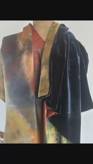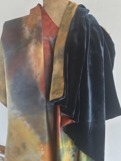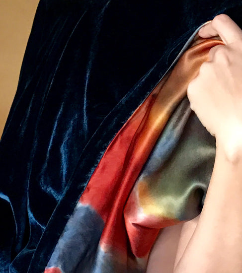 Small hood It is made in midnight blue silk velvet, finished with a hand-painted satin lining which adds light and character to the movement. Small hood It is made with artisanal care, and it is a light and versatile garment, capable of delicately transforming even the simplest outfit.