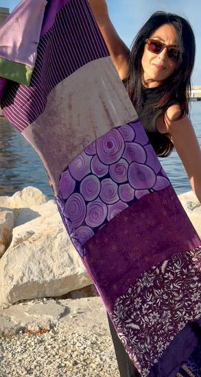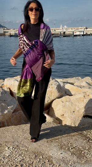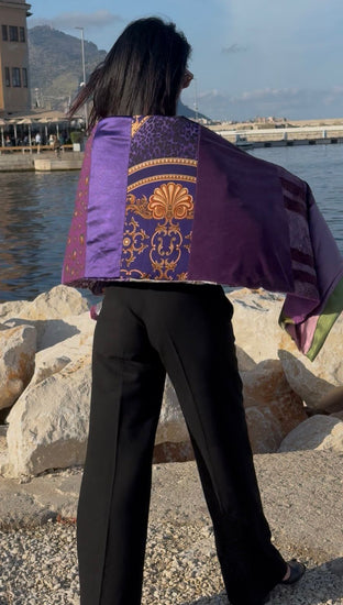 There Sea of Plots it's a patchwork stole with a strong and sophisticated character. The panels of Sea of Plots combine different motifs, geometric, classic, micro-patterns and soft patterns, in a chromatic balance which remains elegant even in variety.