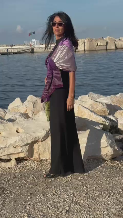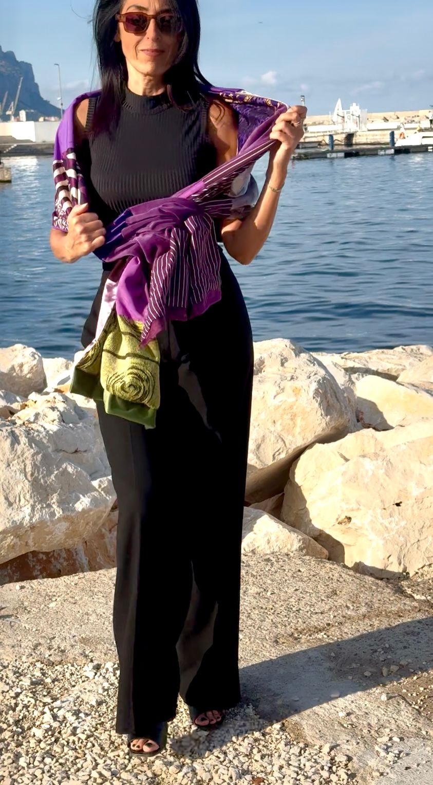 The fabric of Sea of Plots It is light and fluid, with a soft fall that accompanies movements without weighing down the figure. Sea of Plots It is an accessory designed to give personality to an essential outfit, or to add depth to an already sophisticated look.