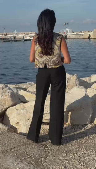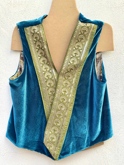 Il Turchese Samarcanda è un gilet che trasforma ogni outfit. Sul lato in velluto, risalta con pantaloni ampi color cammello o una gonna lunga in seta, perfetto per serate o eventi speciali. Sul lato a disegno tipo broccato, assume un carattere più bohémien e quotidiano: ideale su una camicia bianca, un denim morbido o un abito di lino estivo.