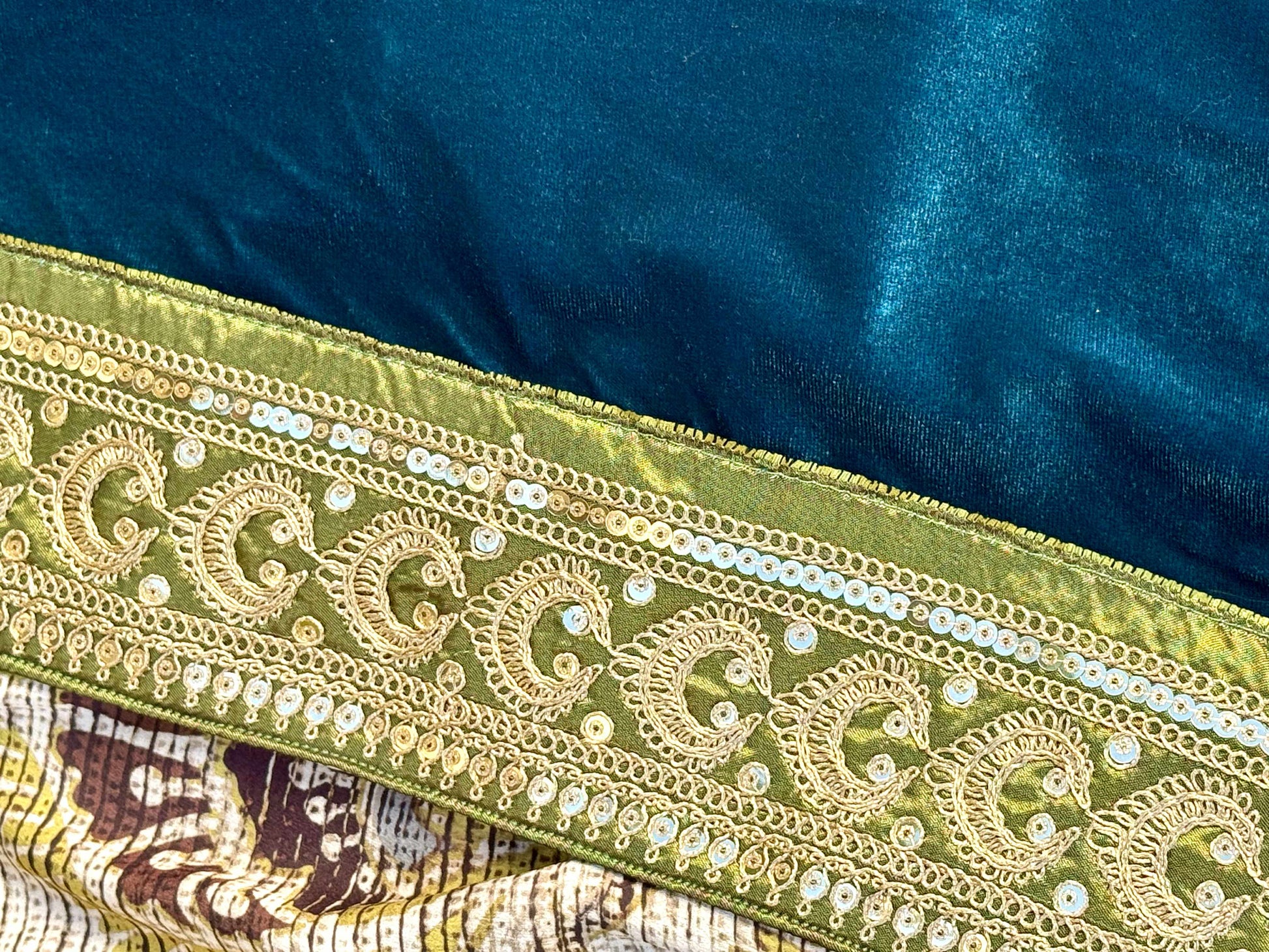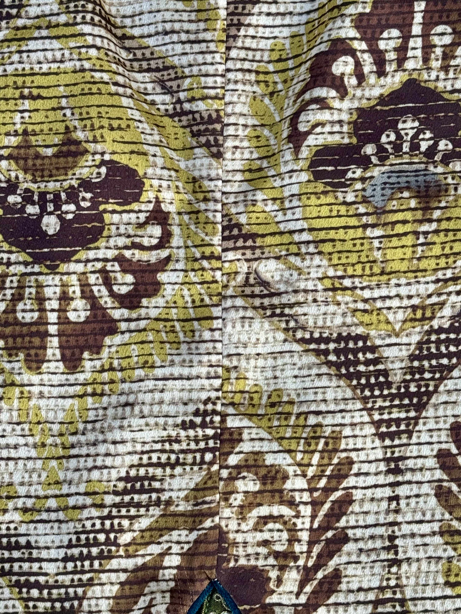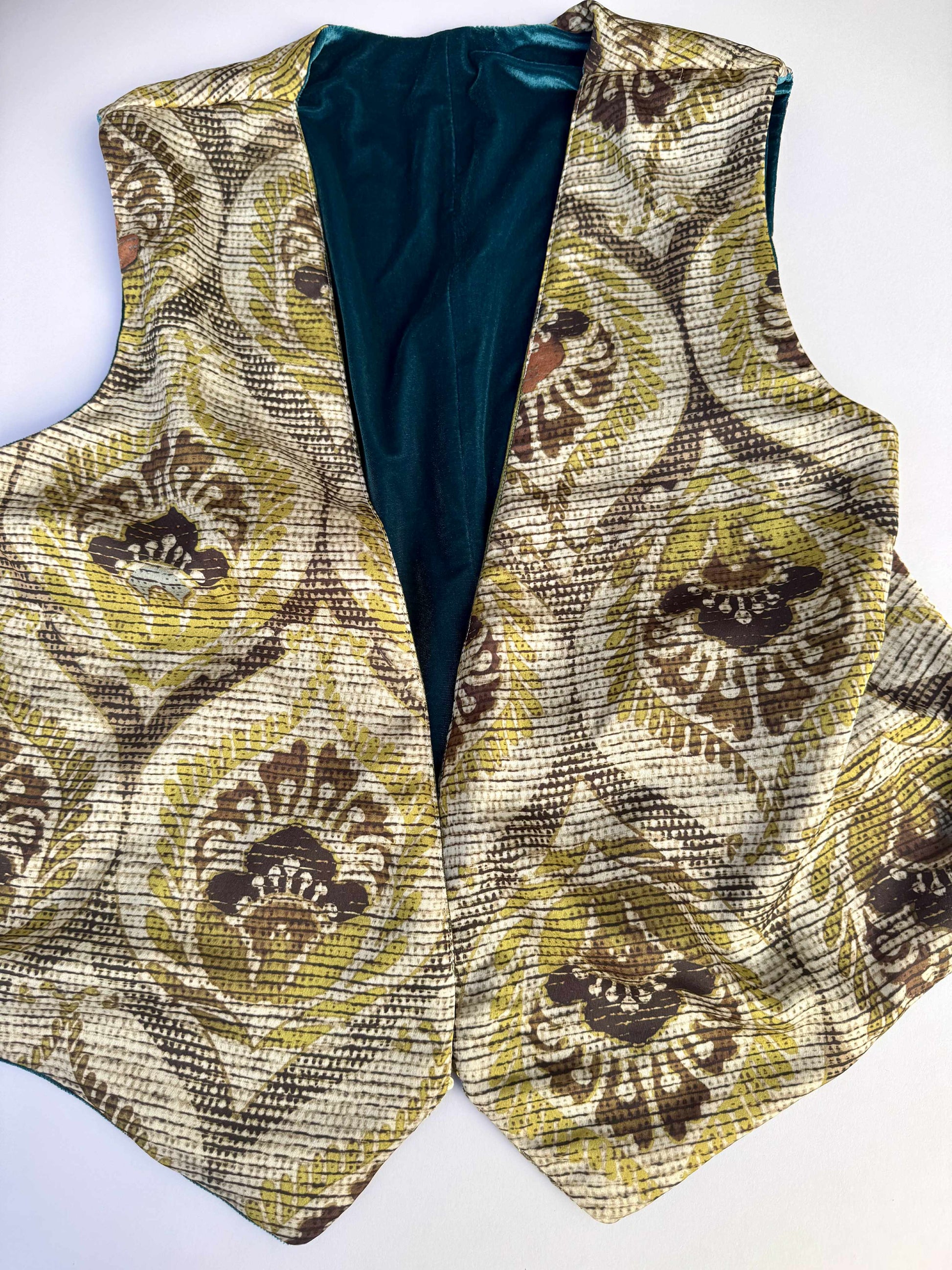 Il Gilet Turchese Samarcanda nasce dall’incontro tra il fascino dell’Oriente e la raffinatezza artigianale italiana. Da un lato, Turchese Samarcanda è in velluto color turchese intenso, morbido e brillante, decorato da bordi ricamati in oro e verde oliva che ricordano i motivi delle antiche sete uzbeke. Dall’altro, una fantasia geometrico-floreale in toni naturali di senape, bronzo e crema, ispirata ai tessuti d’arredo vintage di inizio Novecento.