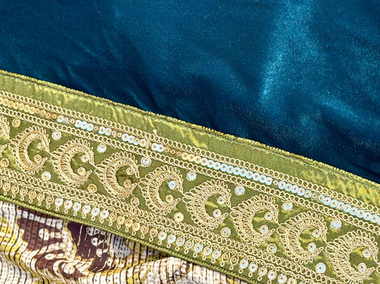 Turchese Samarcanda è realizzato artigianalmente, misura circa 50 cm di lunghezza e 46 cm di larghezza (taglia 42 italiana). Il lato principale di Turchese Samarcanda è in velluto di cotone, impreziosito da nastri ricamati a filo metallico e micro paillettes; il lato opposto è a disegno tipo broccato in misto viscosa che dona struttura e un effetto materico. Le finiture interne di Turchese Samarcanda sono curate a mano, per garantire una perfetta reversibilità e comfort.