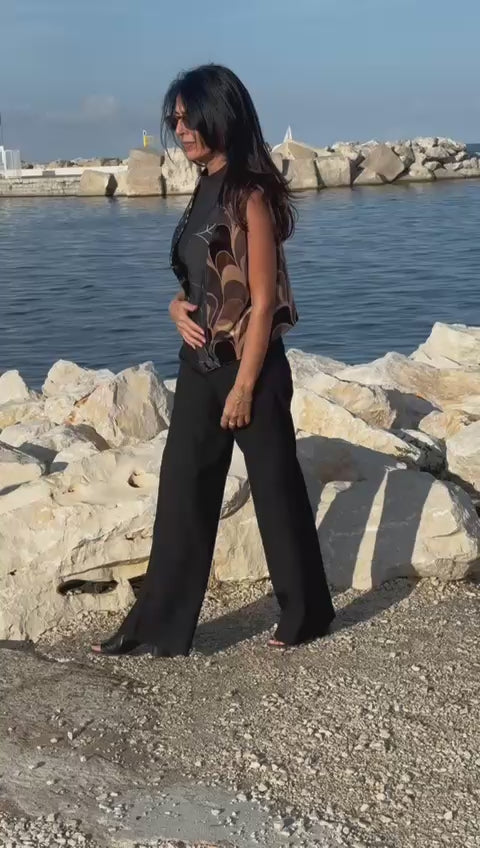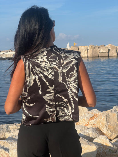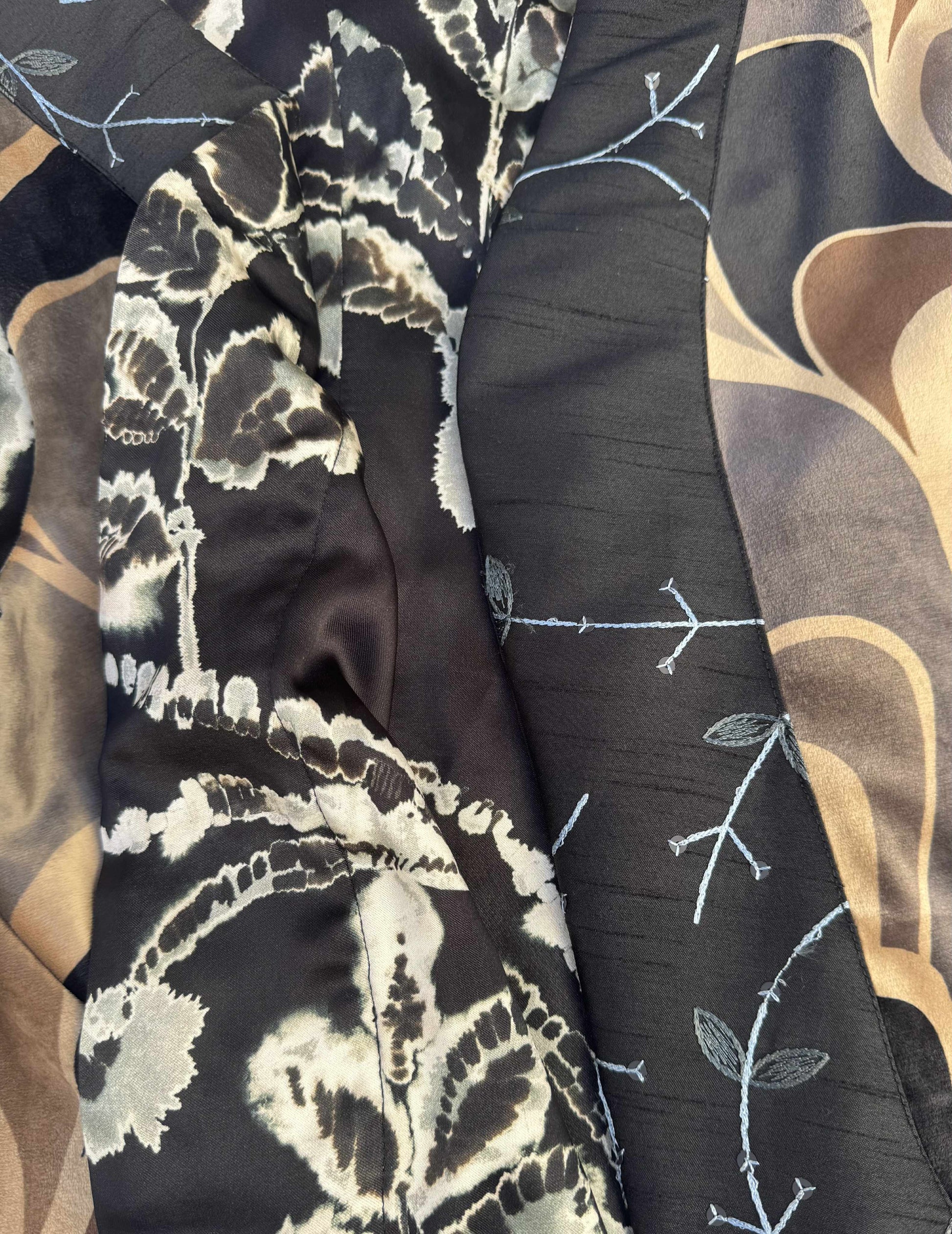 Il Gilet Notte di Marrakech incarna l’eleganza più profonda e sensuale della collezione. Da un lato, sinuosi motivi grafici in toni caldi, caramello, moka e champagne , disegnano curve morbide su un fondo setoso color caffè, evocando le decorazioni anni ’70 e le atmosfere del deserto al tramonto. Dall’altro, un tessuto nero con ricami argentati e motivi floreali tono su tono, che aggiunge un’allure notturna e raffinata.