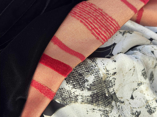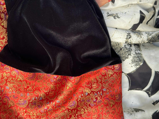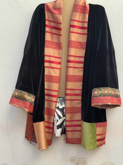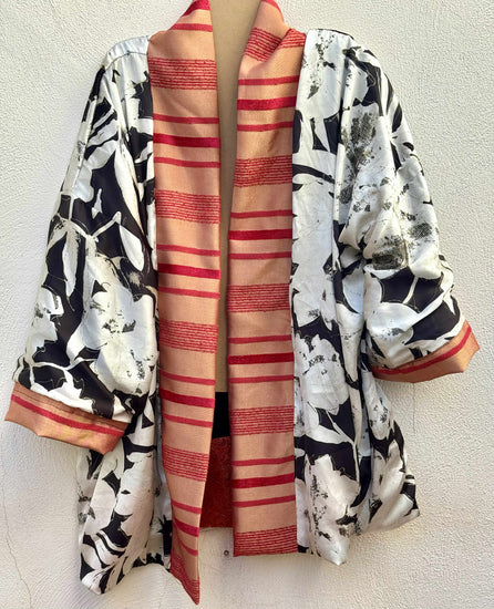 Metamorfosi è una giacca reversibile è un capo dallo stile unico e raffinato, pensato per chi ama distinguersi con eleganza. Da un lato, il velluto nero profondo esalta la luminosità dei dettagli, le bordature rosso corallo e le applicazioni decorative sui polsi e sul fondo, creando un contrasto sofisticato e teatrale. Dall’altro, la fantasia astratta in bianco e nero regala un effetto contemporaneo e artistico, ideale per un look più urbano o creativo. Il collo e i bordi in tessuto a righe rosse e rosa salmone uniscono i due mondi in un equilibrio di forza e delicatezza.