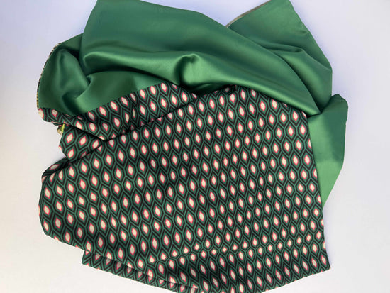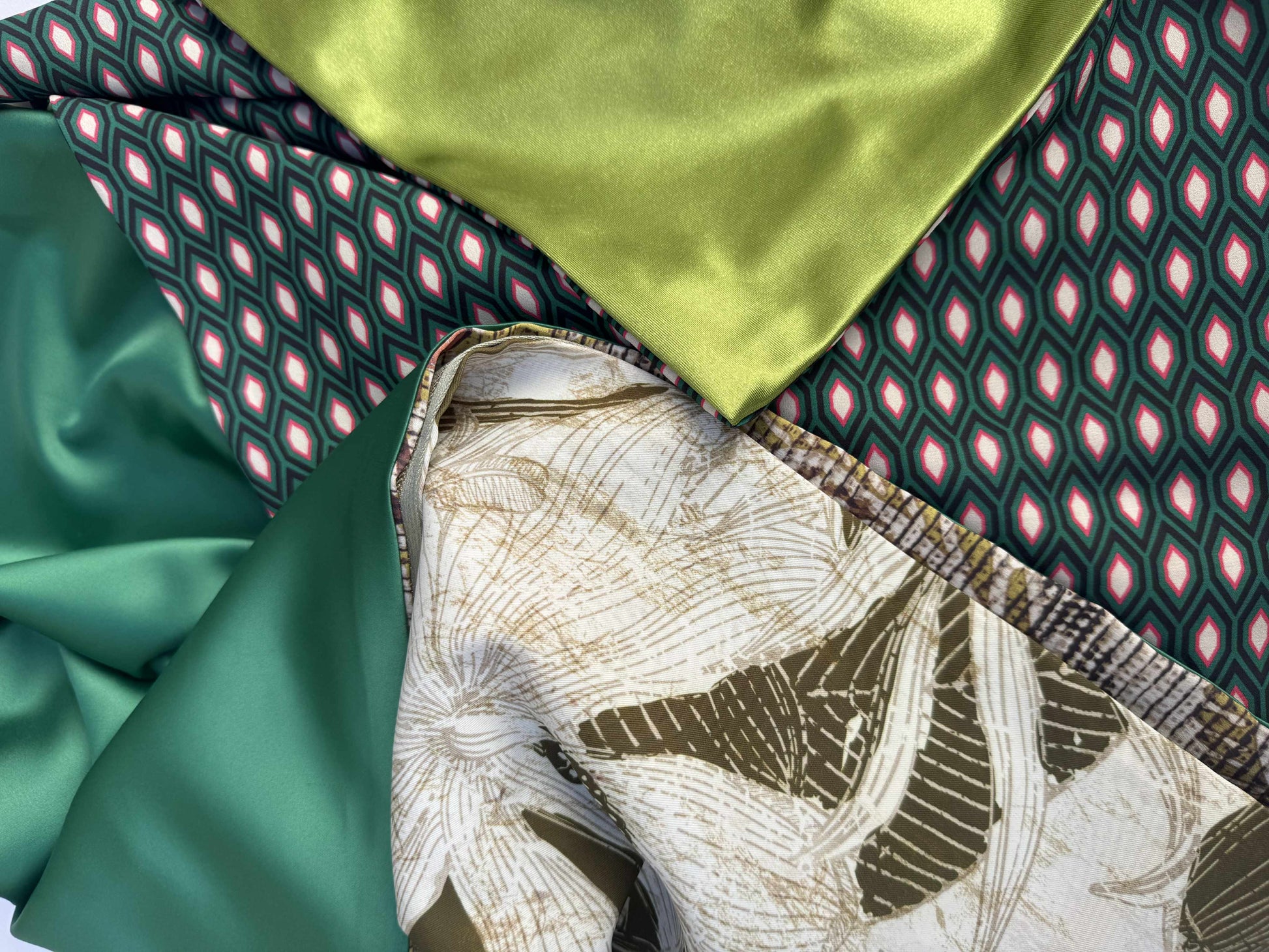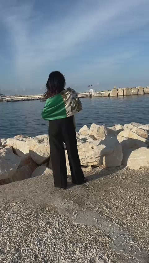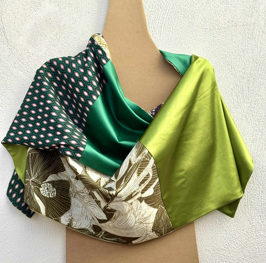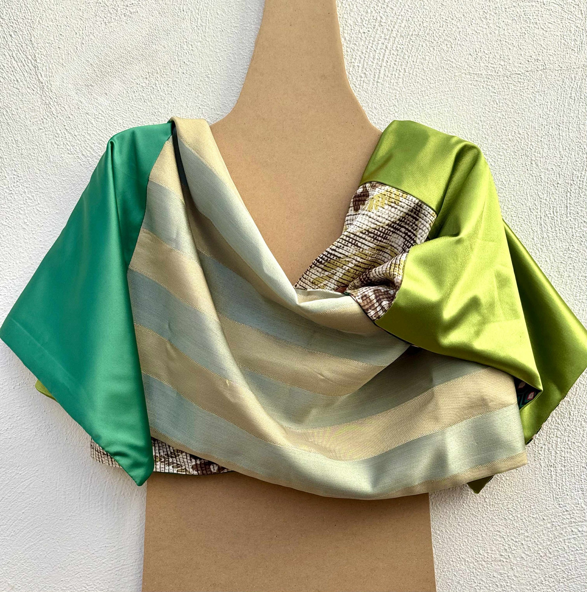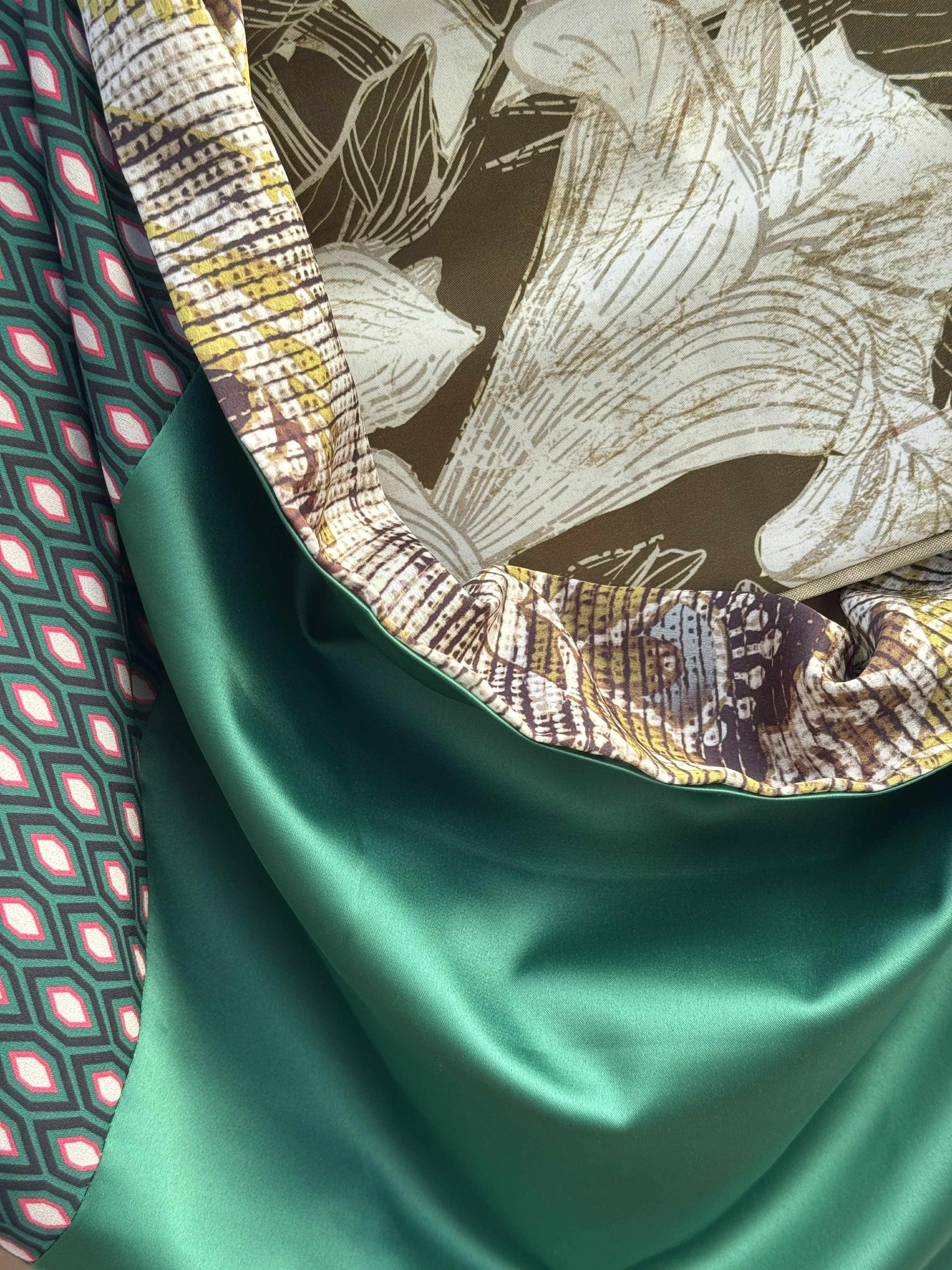 La Sciarpa Aurora Verde di Luce celebra l’armonia tra natura e geometria, con un patchwork che unisce la lucentezza del verde smeraldo e del lime satinato a motivi botanici e grafismi rétro. I tessuti si alternano come fasci di luce: il verde brillante riflette la vitalità della primavera, il motivo geometrico ricorda i mosaici degli anni Sessanta, mentre i grandi fiori stilizzati in beige e cacao aggiungono un tocco organico e sofisticato.