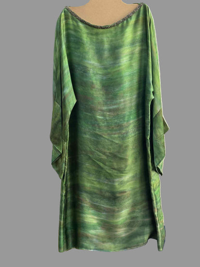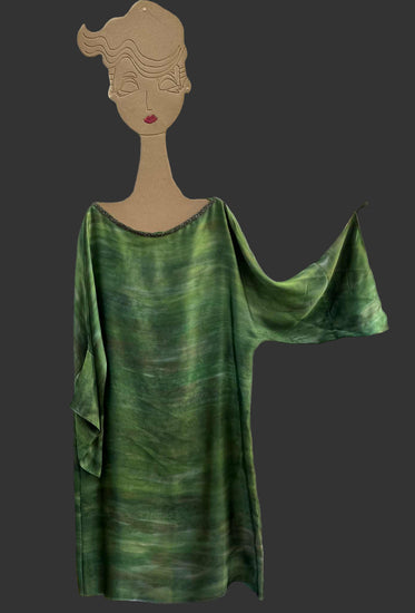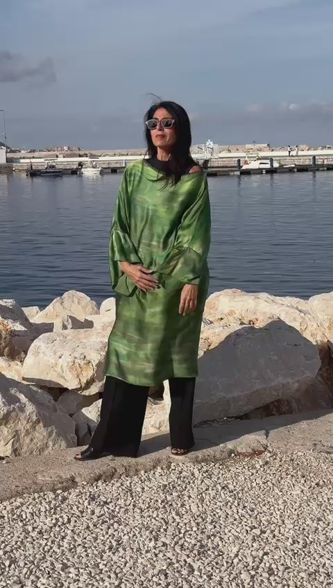 Smeraldo , vestito di seta verde striata, è un capo unico e raffinato, realizzato con la maestria artigianale di Lemore'. La seta morbidissima è stata dipinta a mano con colori unici e irripetibili, creando un effetto artistico esclusivo. La forma di Smeraldo è quella di una casacca o camicione morbido, con scollatura a barca e maniche a tre quarti. La scollatura è bordata da una passamaneria gioiello.