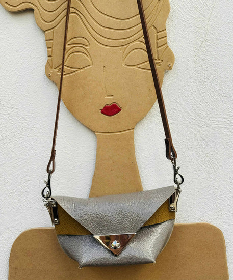 Prisma è una borsa a tracolla compatta, dal design geometrico e asimmetrico, realizzata in pelle martellata grigia con inserto a contrasto in pelle liscia color ocra senape. La patta frontale di Prisma , chiusa da un gancio in metallo cromato lucido dalla forma triangolare, dona un tocco moderno e deciso. La struttura è semi-rigida, con angoli metallici rinforzati che ne accentuano il carattere contemporaneo. La tracolla sottile in pelle chiara permette di indossarla comodamente a spalla o crossbody.