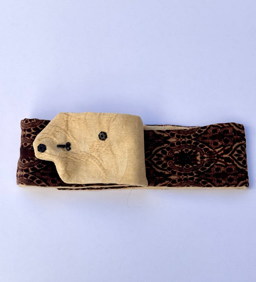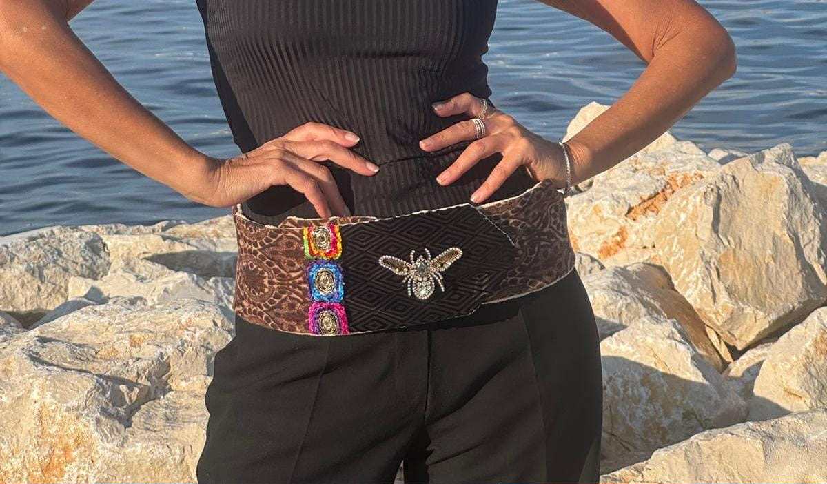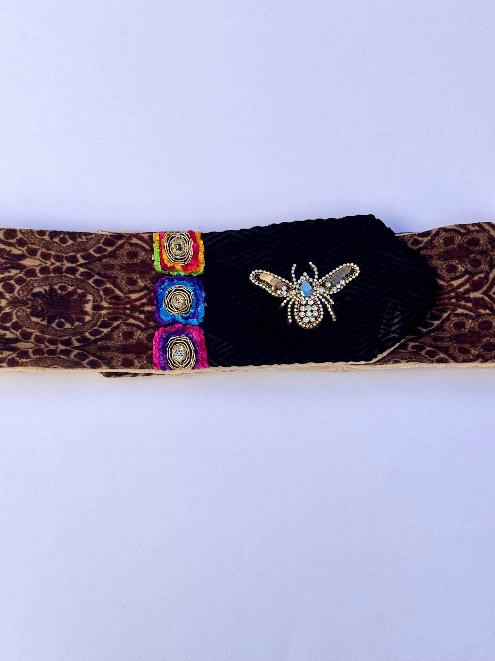 Ape Dorata è una cintura artigianale dal fascino elegante e misterioso, realizzata con tessuti vintage in velluto e broccato nei toni caldi del marrone e dell’oro antico. La parte centrale di Ape Dorata , in velluto damascato a motivo leopardato, è impreziosita da una patta nera con ape gioiello incastonata, decorata con cristalli e perline che catturano la luce con riflessi dorati e azzurri. Una fila di piccoli decori floreali multicolor aggiunge una nota vibrante ad Ape Dorata , bilanciando la profondità dei toni terrosi. L’interno di Ape Dorata , in morbido velluto chiaro, rivela una finitura di grande eleganza e cura sartoriale.