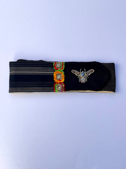 Ape Nera è una cintura artigianale dal fascino sobrio e magnetico, realizzata in tessuti di recupero pregiati nei toni del nero profondo e dell’avorio antico. La parte frontale di Ape Nera alterna motivi geometrici e righe sottili, creando un ritmo elegante e contemporaneo. La patta centrale di Ape Nera , in velluto nero con disegno a rilievo, è impreziosita da una ape gioiello ricamata con cristalli e perline, che catturano la luce con riflessi argentati e azzurro chiaro. Un dettaglio di piccoli ricami floreali multicolor illumina la composizione con un tocco di artigianalità vivace. L’interno di Ape Nera , in tessuto damascato color avorio, rivela la cura sartoriale e la doppia anima della cintura: forte e luminosa al tempo stesso.