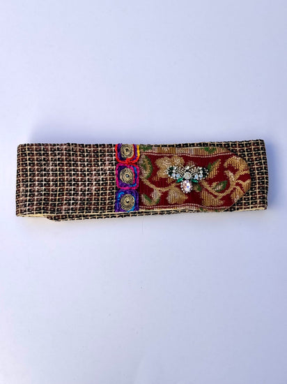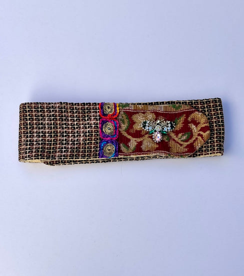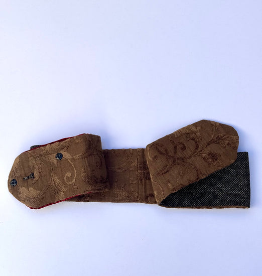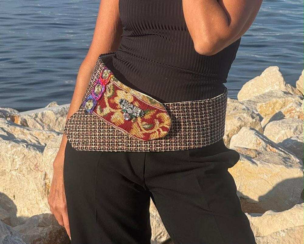 Ape Rubino è una cintura artigianale dal carattere sofisticato e luminoso, realizzata con tessuti vintage intrecciati in nuance di oro brunito, rosso rubino e verde oliva. La patta frontale di Ape Rubino , in broccato rosso decorato con motivi floreali dorati, è impreziosita da una ape gioiello con dettagli di cristalli trasparenti e rosa, che aggiungono un riflesso delicato e femminile. I piccoli ricami floreali multicolor di Ape Rubino , disposti sulla fascia centrale, portano un tocco vivace e contemporaneo. L’interno di Ape Rubino , in damascato marrone con disegno barocco, completa l’opera con una finitura raffinata e una texture calda al tatto.