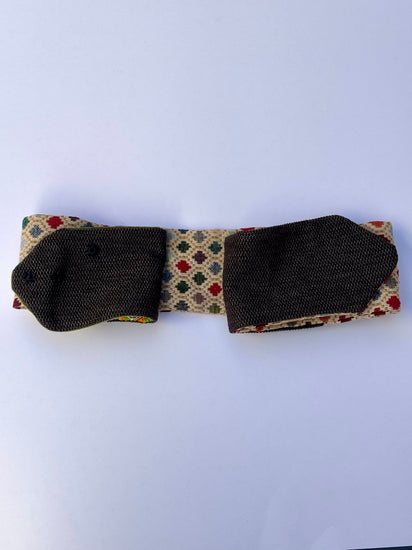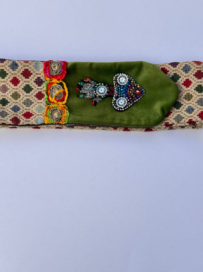Mano Verde è una cintura artigianale dal carattere raffinato e simbolico, realizzata con tessuti vintage intrecciati nei toni del sabbia, verde salvia e bordeaux. La patta frontale di Mano Verde in velluto verde smeraldo è impreziosita da una mano di Fatima ricamata a perline, ricca di sfumature metalliche e riflessi colorati che catturano la luce in modo prezioso. I piccoli ricami floreali multicolor di Mano Verde , collocati nella parte superiore, aggiungono un accento vivace e artigianale. L’interno di Mano Verde , in tessuto scuro a grana grossa, contrasta con eleganza i toni luminosi del fronte, completando un insieme di grande equilibrio visivo e materico.