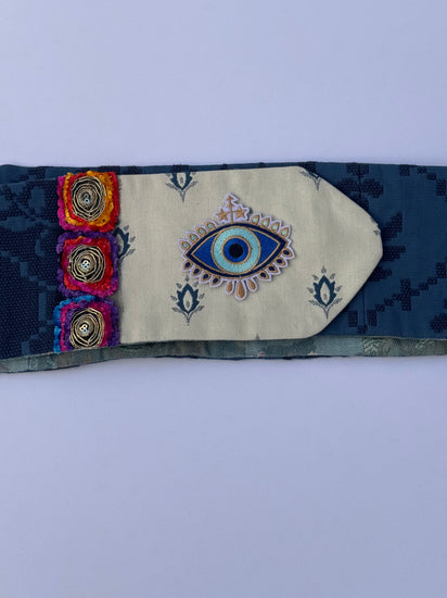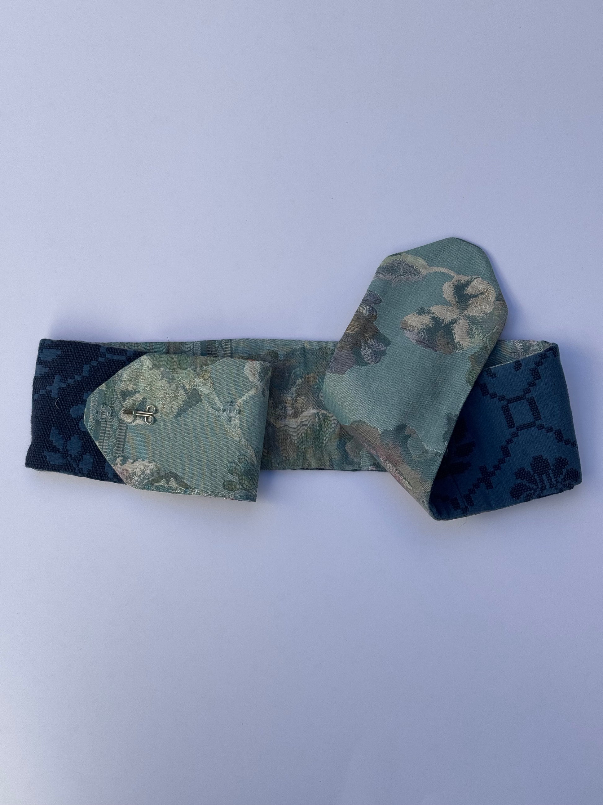 Occhio Blu è una cintura artigianale realizzata con tessuti damascati e broccati di recupero, accostati in un raffinato gioco di contrasti. La parte frontale di Occhio Blu presenta un elegante motivo a rombi blu notte con dettagli floreali in rilievo, arricchita da una patta in tessuto chiaro ricamata con un grande occhio protettivo blu , simbolo di energia positiva e protezione. Una fila di piccoli decori floreali multicolor impreziosisce la parte superiore, aggiungendo un tocco vibrante e contemporaneo. L’interno di Occhio Blu rivela una fodera in tessuto floreale verde salvia, che completa l’opera con una nota di delicatezza rétro.