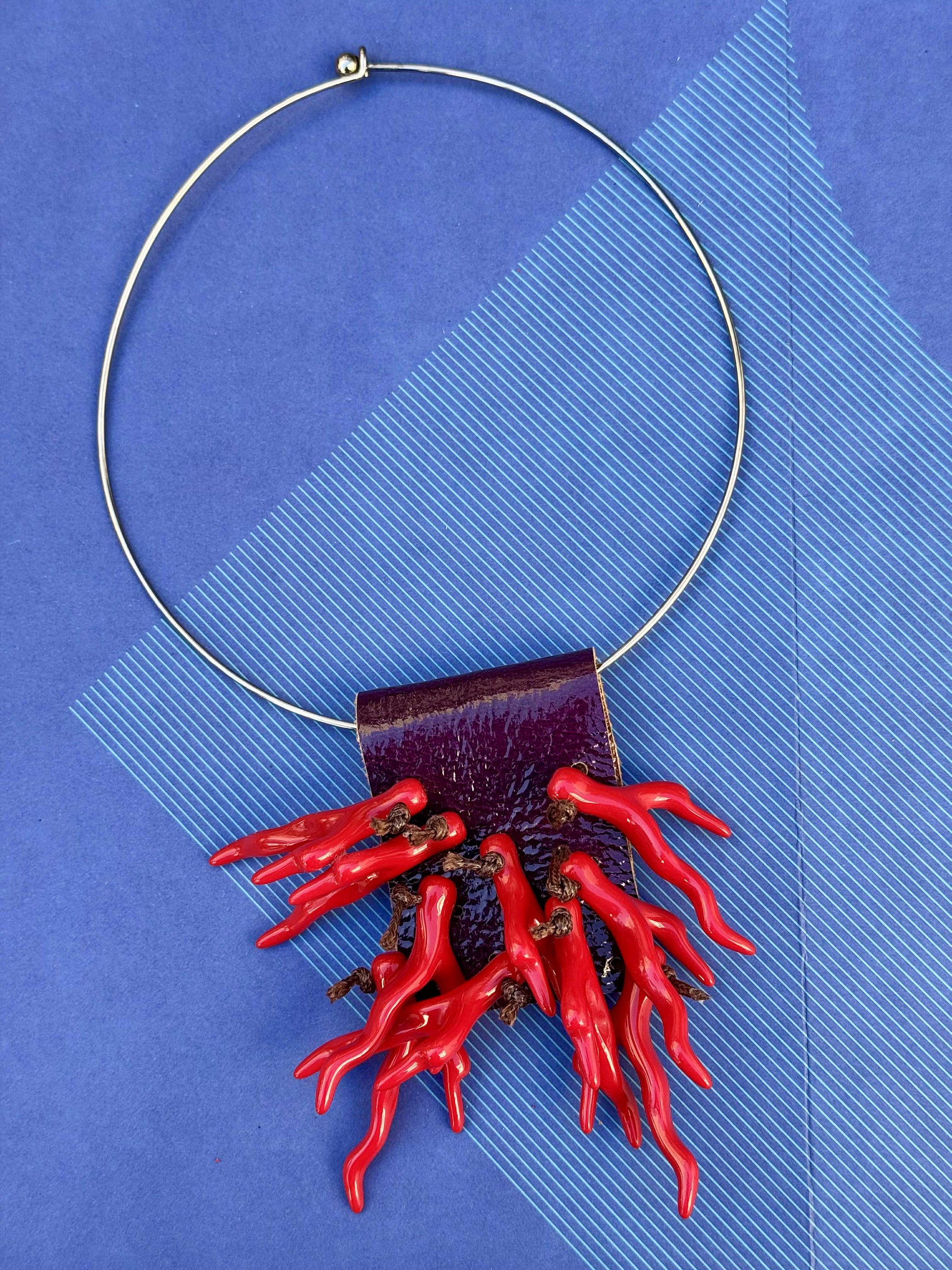Corallo è formata da un pendente in pelle viola e applicazioni in resina rossa a forma di rametti, dinamici e irregolari.