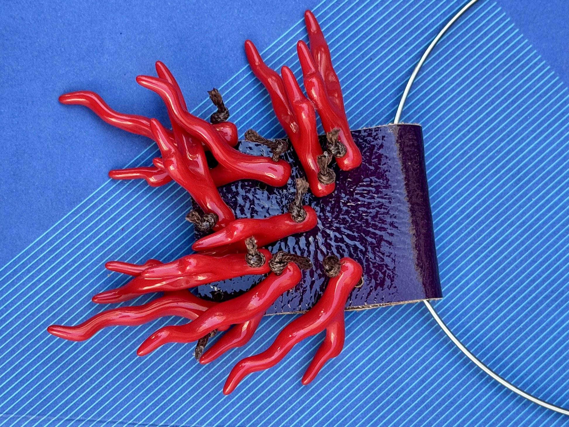 Corallo è una collana rigida dal design audace e scultoreo, realizzata su base metallica circolare con chiusura a sfera.