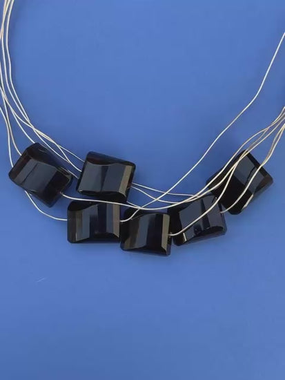 La disposizione asimmetrica e leggermente sovrapposta dei cristalli di Gocce di Notte Stellata conferisce alla collana un aspetto scultoreo e artigianale. È un pezzo che unisce il rigore delle forme geometriche al calore lussuoso dei fili dorati, perfetto per chi cerca un'eleganza contemporanea e di forte personalità