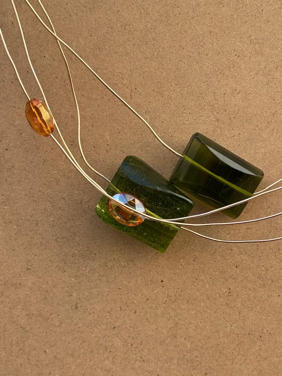 elementi centrali di Gocce di Muschio sono due grandi blocchi rettangolari di resina traslucida. Uno è di un verde muschio vibrante, mentre l'altro è di un verde bosco scuro, quasi nerastro. La loro forma squadrata contrasta con la morbidezza dei fili.