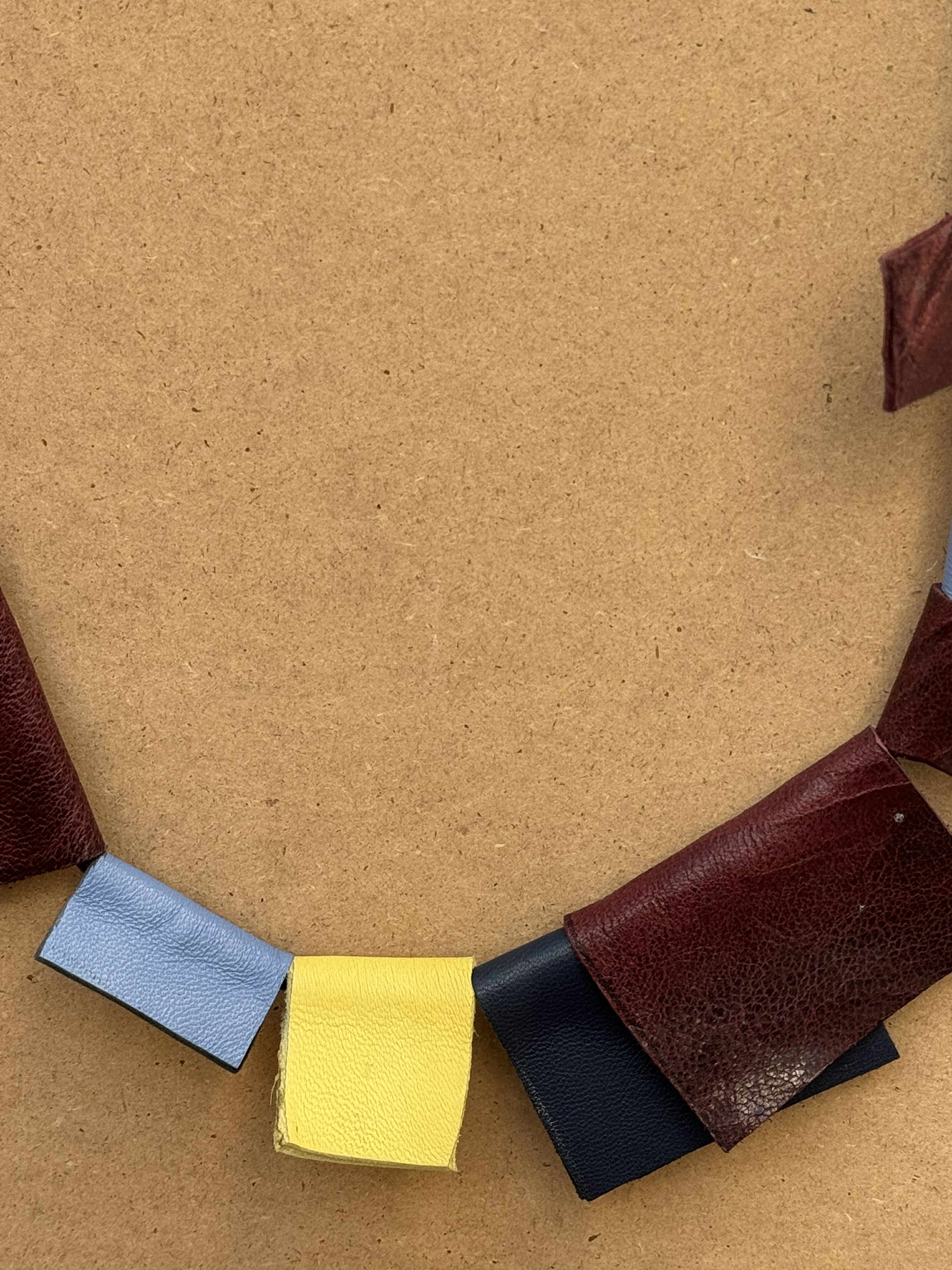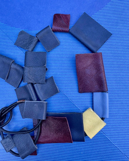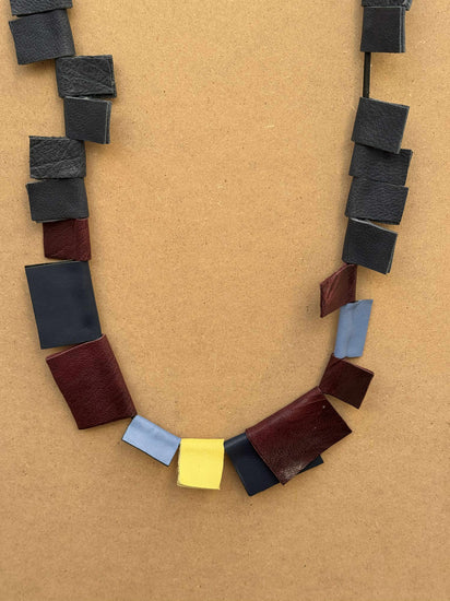 Kubika è una collana artigianale dal design scultoreo, composta da moduli rettangolari in pelle di diversi colori (nero, bordeaux, blu, giallo, azzurro), infilati lungo un supporto flessibile nero. Le tessere in pelle di Kubika , con finiture lucide e opache alternate, creano un ritmo visivo deciso, quasi architettonico. Il gioco cromatico rende il pezzo unico, moderno e molto grafico.