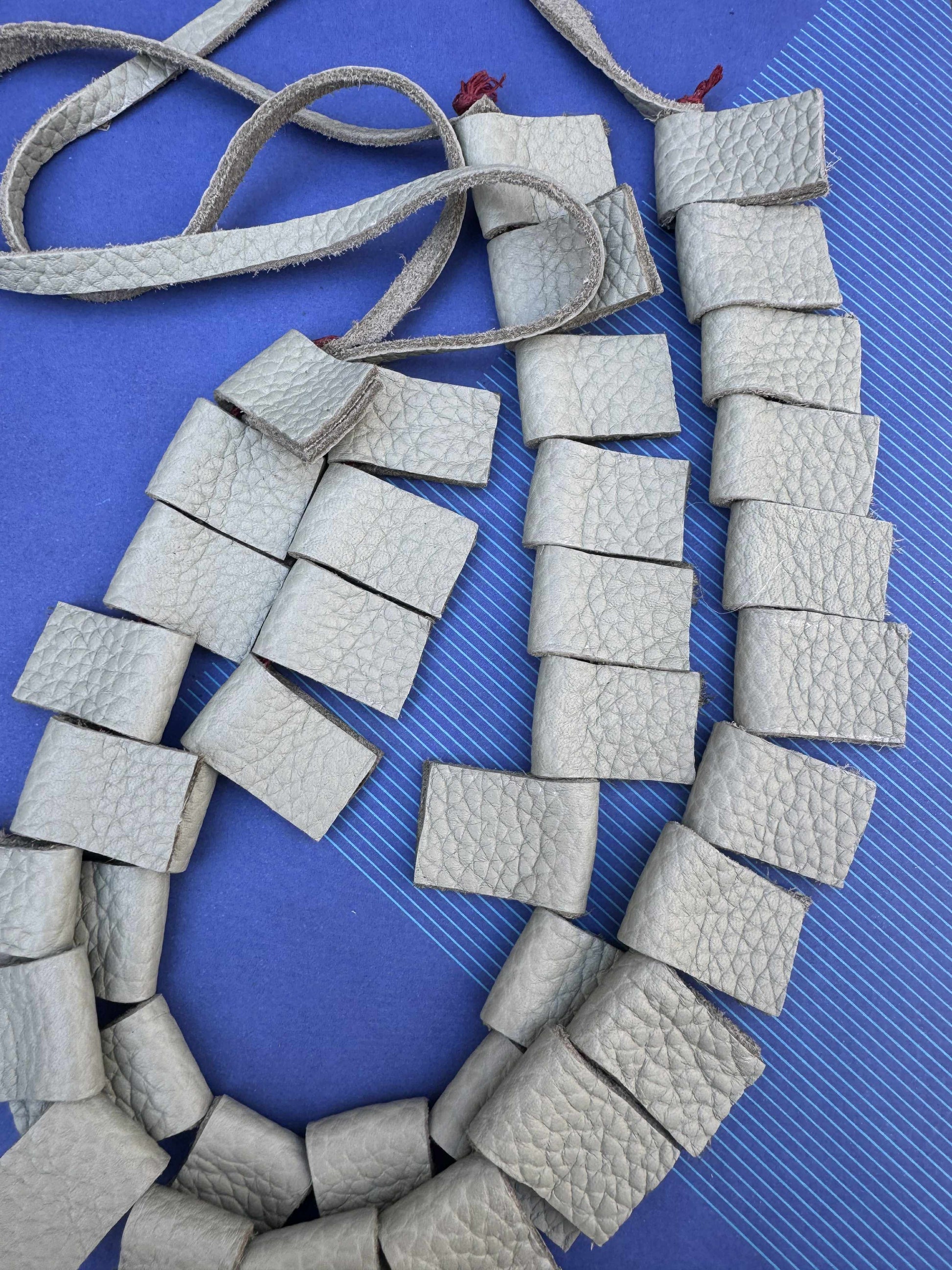 Origami è una collana artigianale dal design essenziale e scultoreo, composta da una sequenza di moduli quadrati e rettangolari in pelle verde salvia martellata. Ogni elemento di Origami è piegato e infilato su un doppio laccio in pelle dello stesso colore, creando un ritmo dinamico e materico. L’aspetto di Origami è tridimensionale e versatile, capace di trasformare un look semplice in un insieme di forte impatto visivo.