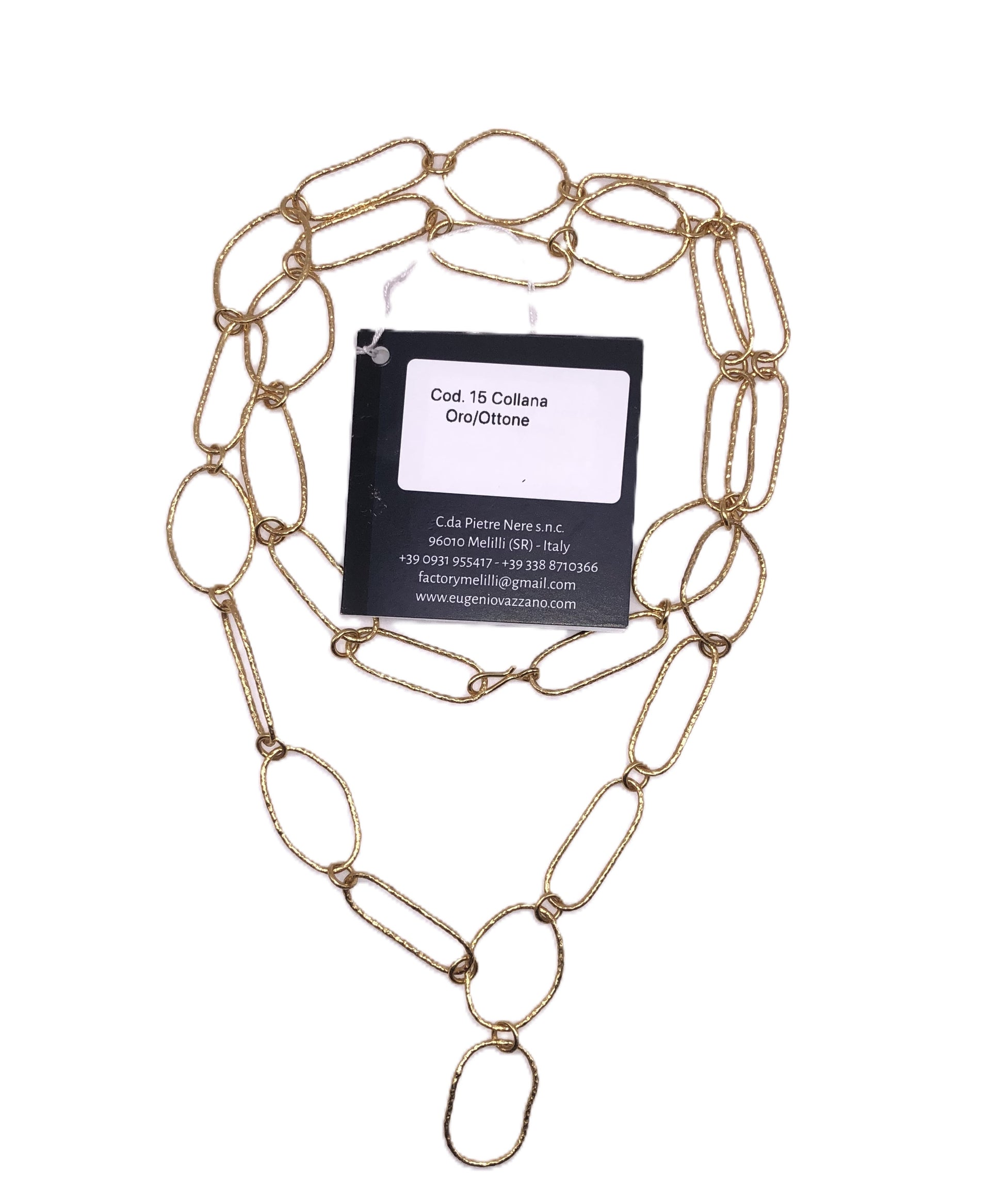 La nuova linea di collane artigianali di Eugenio Vazzano, è un progetto nato quasi un anno fa e sviluppato in collaborazione con un giovane orafo formato presso la Scuola Orafa di Firenze. Ogni pezzo è realizzato completamente a mano: le maglie vengono modellate una a una, incastrate con precisione e saldate con una finitura impercettibile, che dona continuità e raffinata eleganza alla catena.