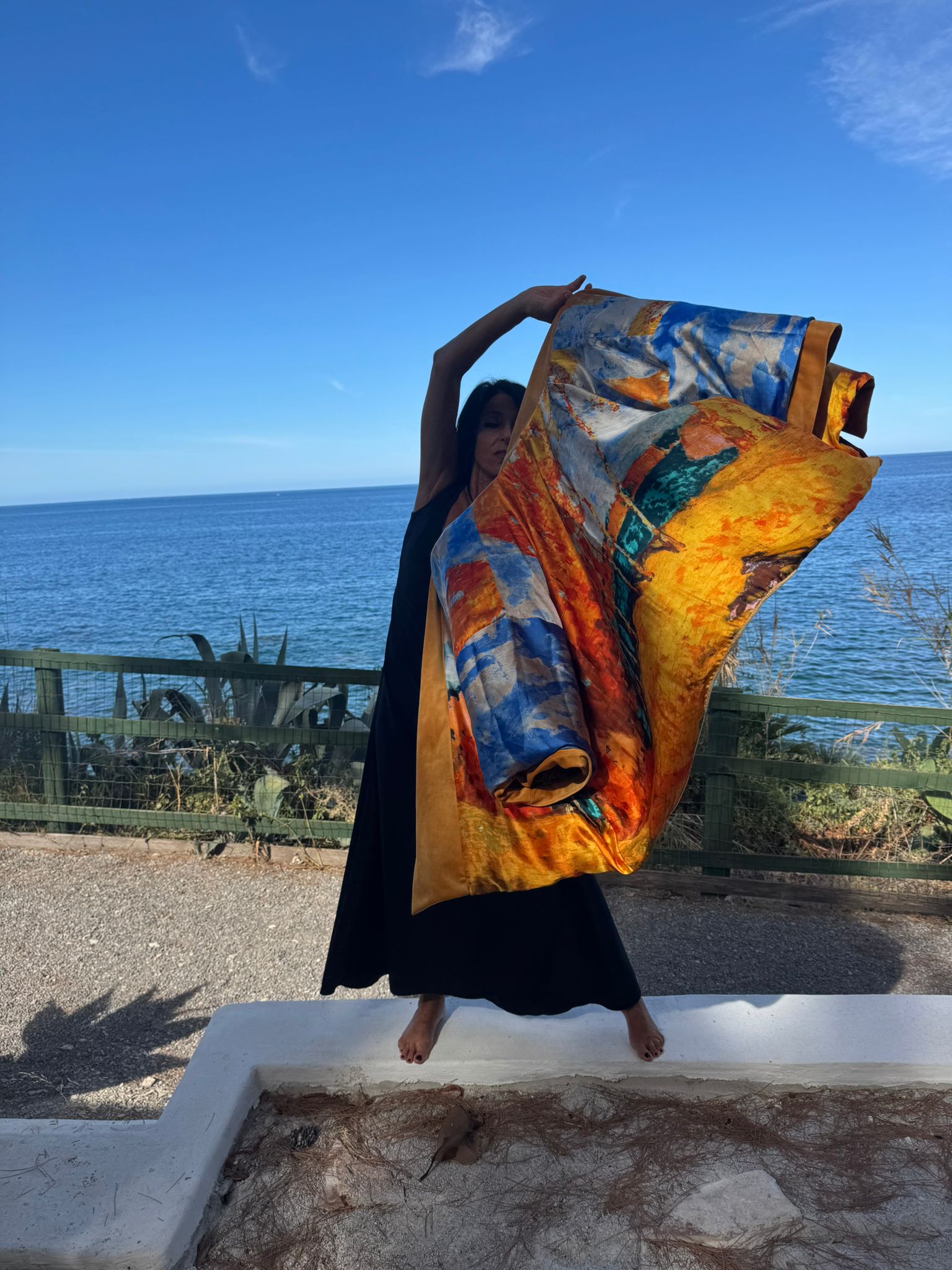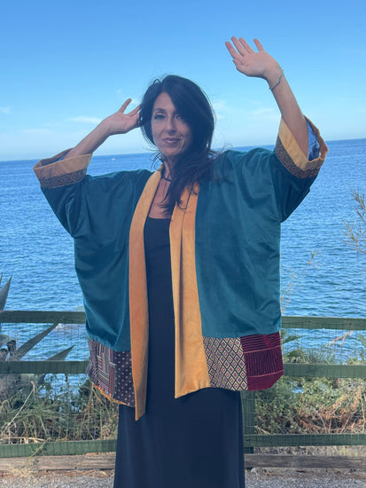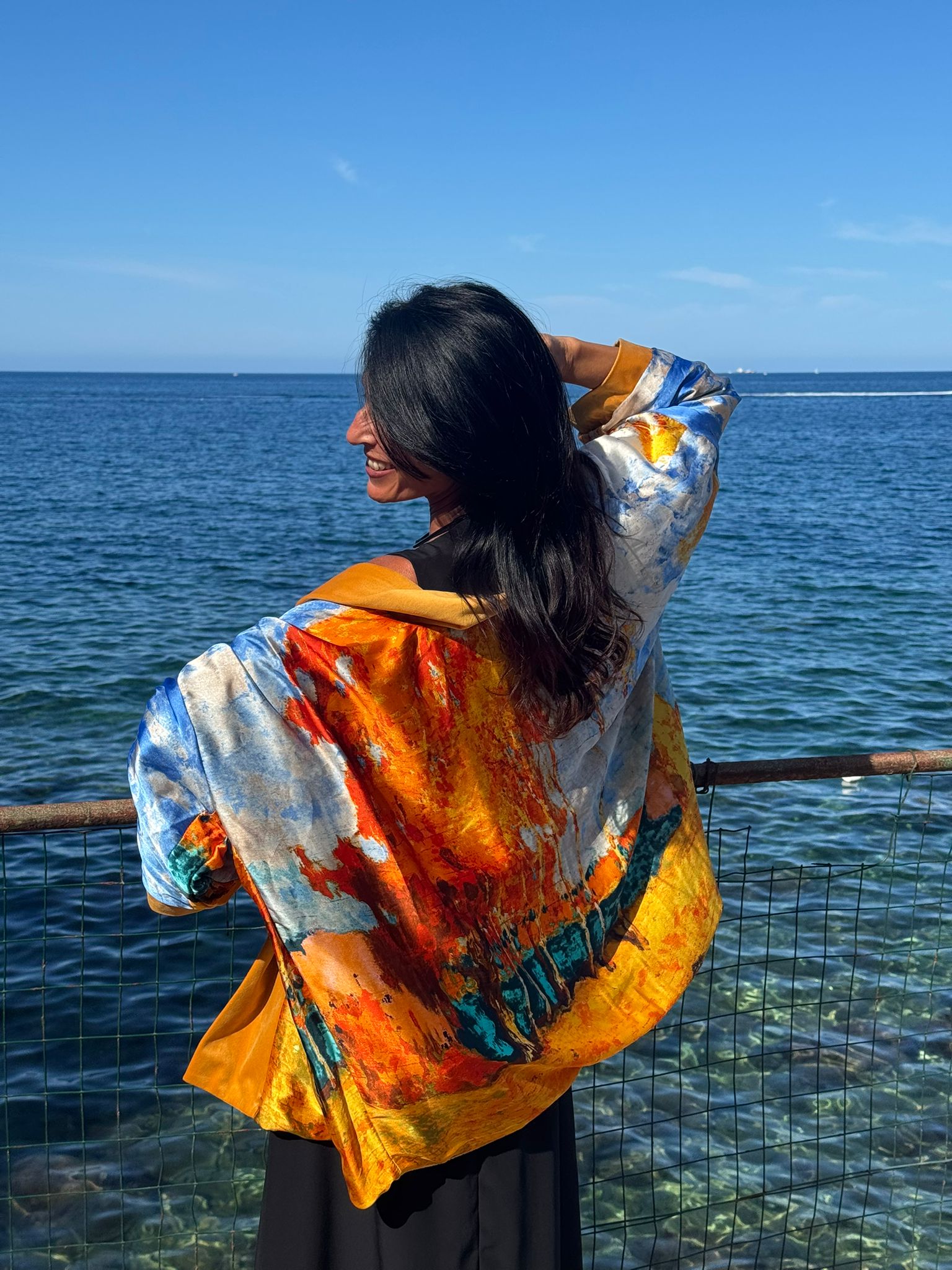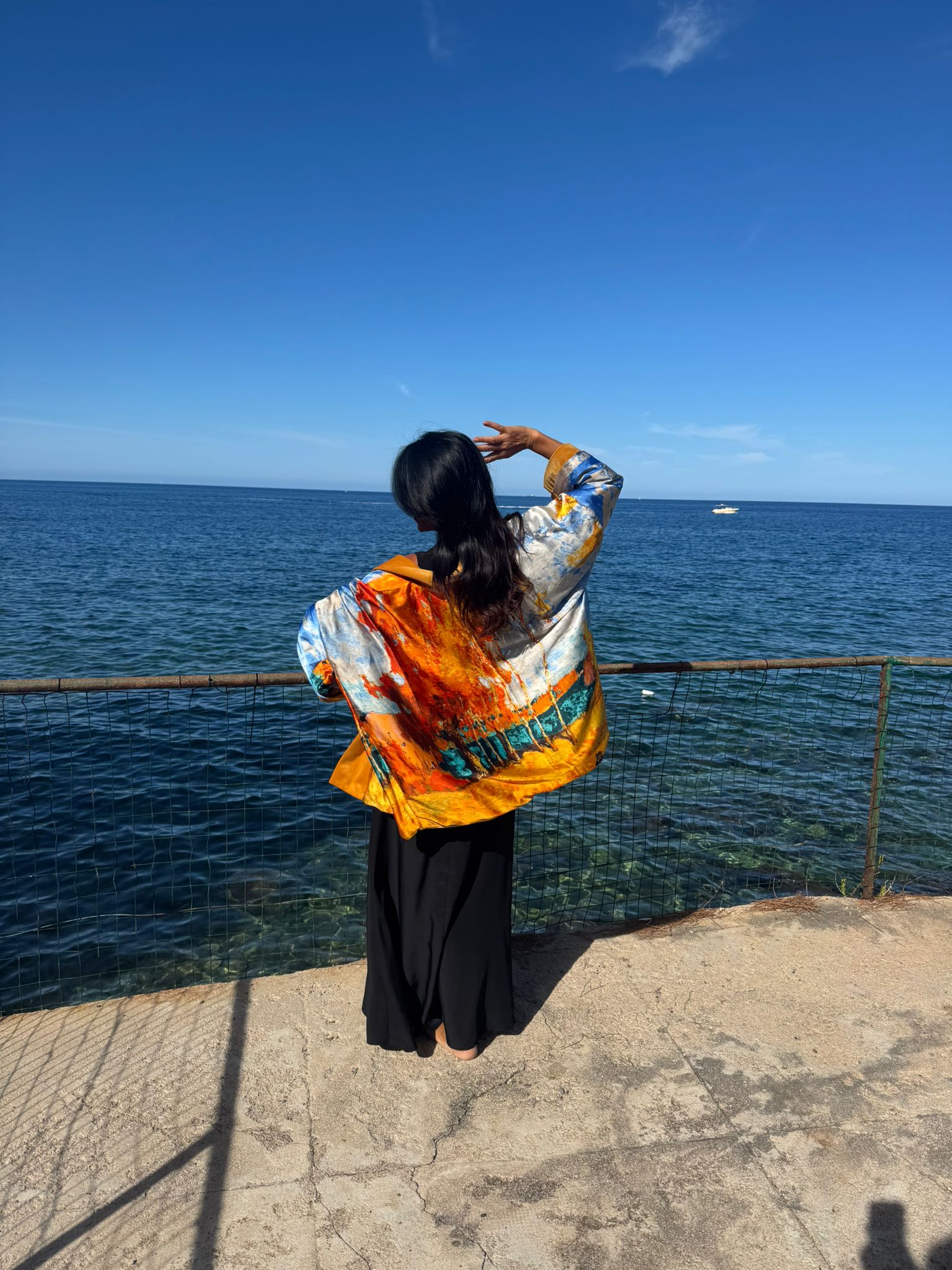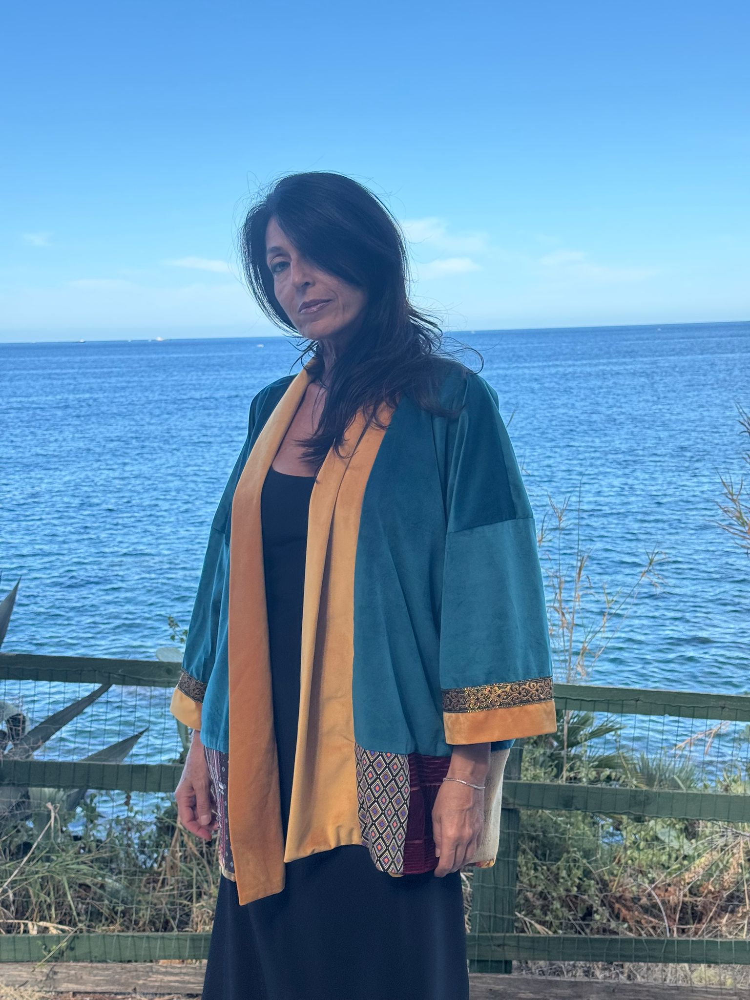 Atria è una giacca dal carattere luminoso e poliedrico. Atria è realizzata in morbido velluto turchese con bordature color senape e inserti patchwork nei toni del rosso vino e dei motivi geometrici, ha un’eleganza sobria e raffinata. La vera forza di Atria sta nella reversibilità: indossata sul lato interno, si trasforma in un’esplosione di colore con stampe pittoriche che ricordano un’opera astratta, tra sfumature di arancio, blu e giallo dorato. Due anime in un solo capo: più classica e regale sul velluto, più artistica e vibrante sul lato dipinto.