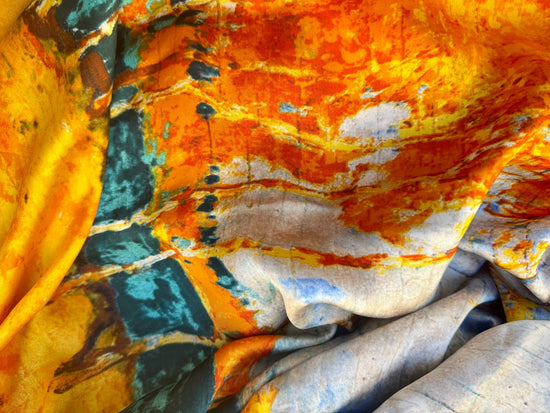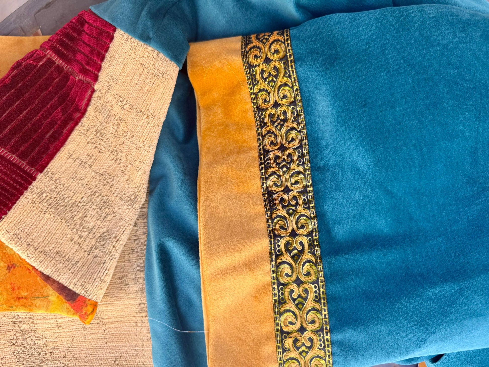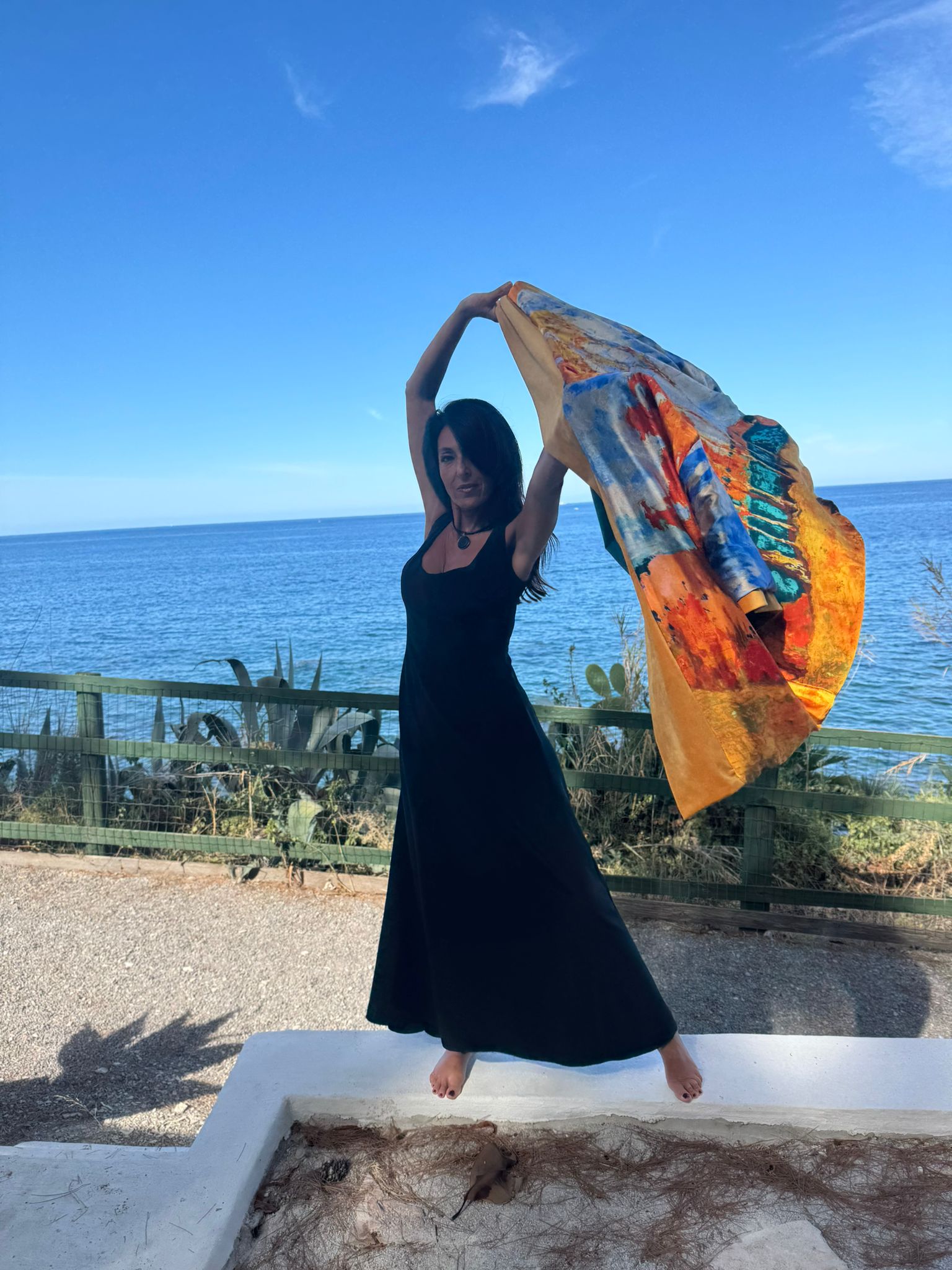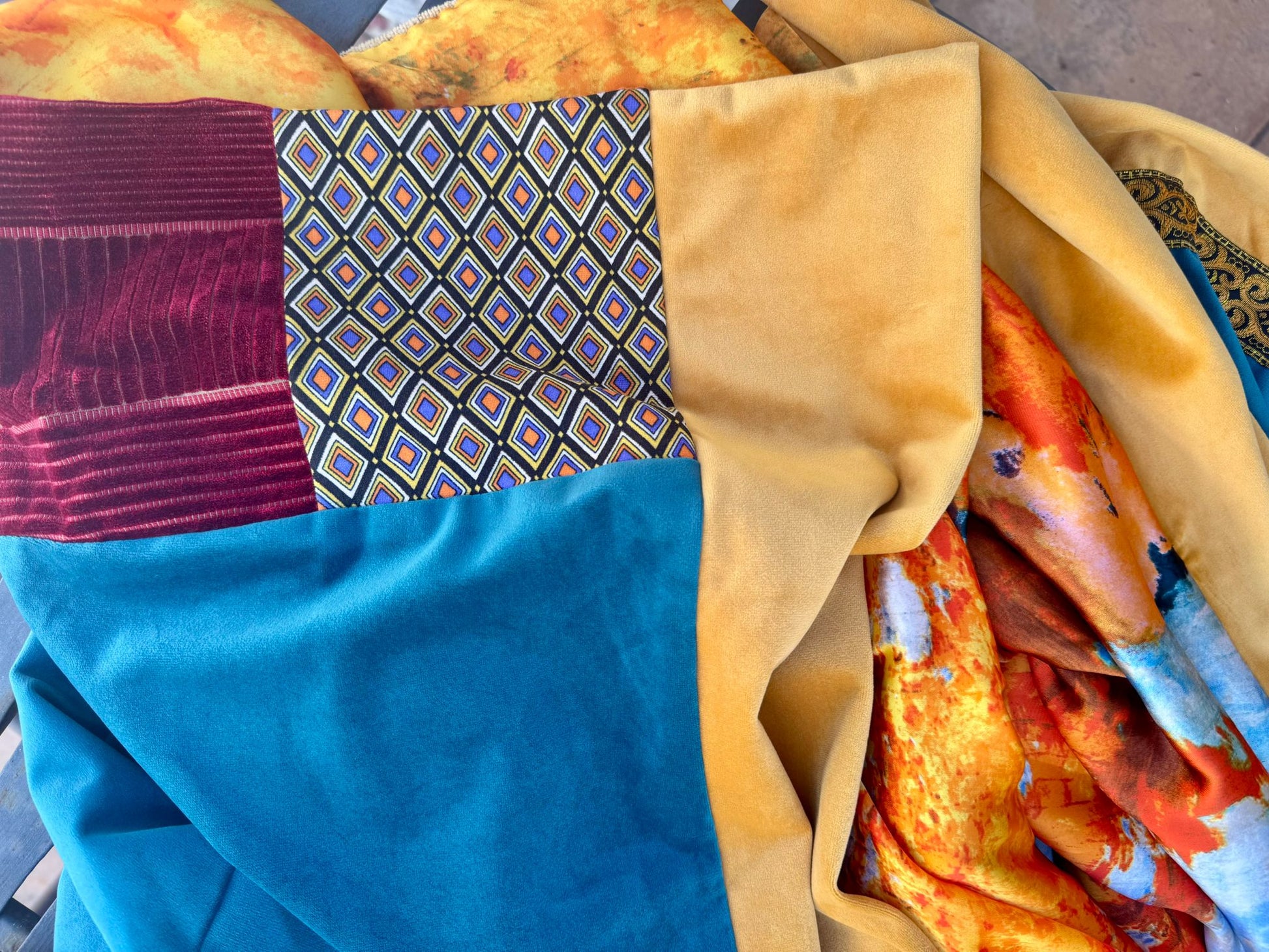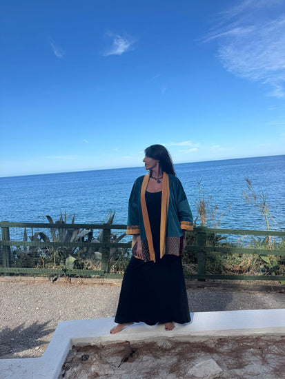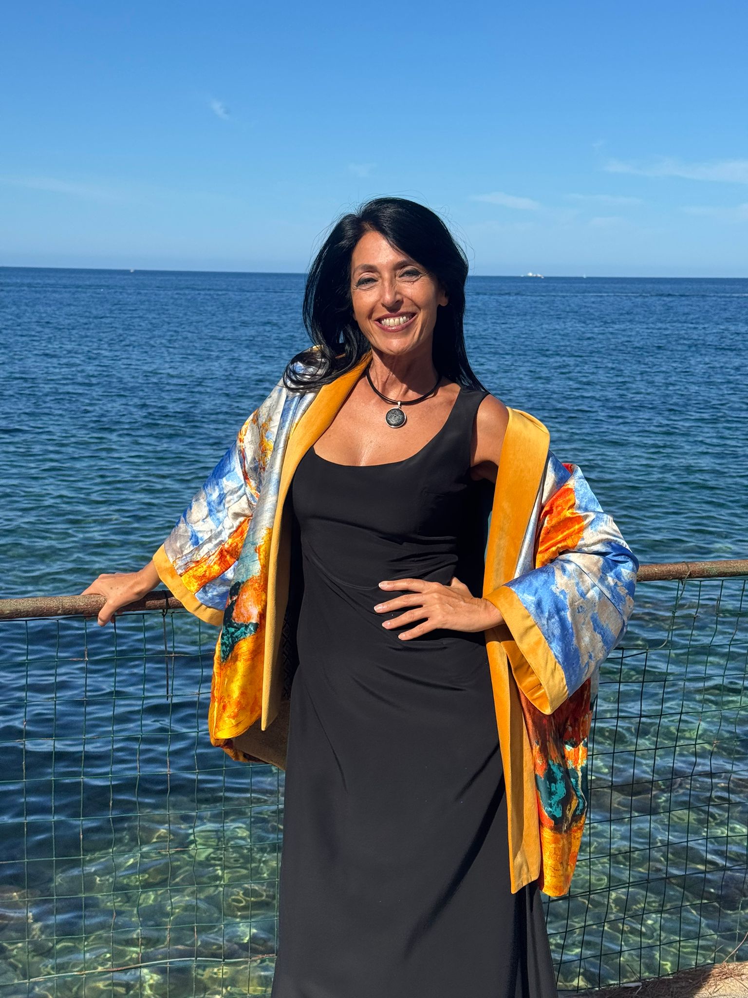 Atria è una giacca dal carattere luminoso e poliedrico. Atria è realizzata in morbido velluto turchese con bordature color senape e inserti patchwork nei toni del rosso vino e dei motivi geometrici, ha un’eleganza sobria e raffinata. La vera forza di Atria sta nella reversibilità: indossata sul lato interno, si trasforma in un’esplosione di colore con stampe pittoriche che ricordano un’opera astratta, tra sfumature di arancio, blu e giallo dorato. Due anime in un solo capo: più classica e regale sul velluto, più artistica e vibrante sul lato dipinto.