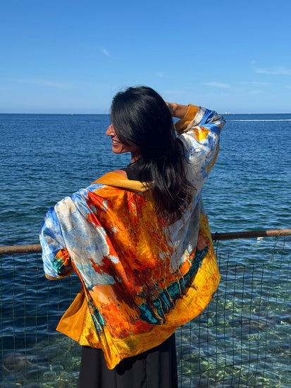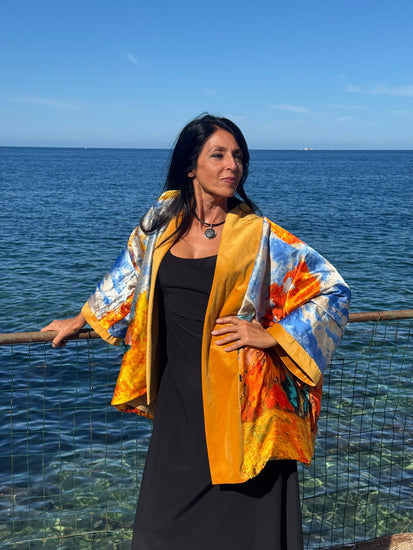 Indossa Atria sul lato velluto per occasioni formali o serate eleganti, abbinandola ad abiti neri o monocromo scuri per esaltarne il carattere sofisticato. Gira Atria sul lato stampato per un look audace e creativo: perfetta sopra un outfit minimal che lasci spazio ai colori, oppure come protagonista assoluta in un contesto artistico o vacanziero. Atria può diventare una giacca da viaggio ideale, trasformandosi da capo elegante a esplosione cromatica con un semplice gesto.
