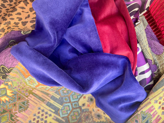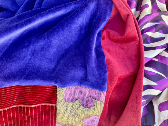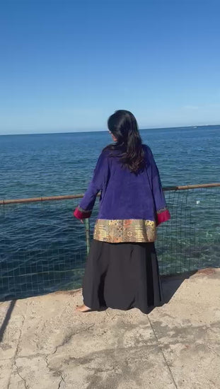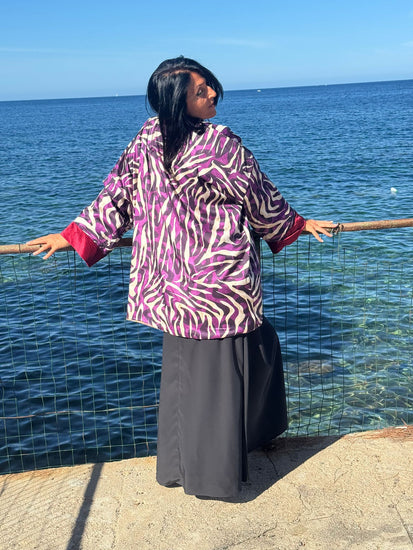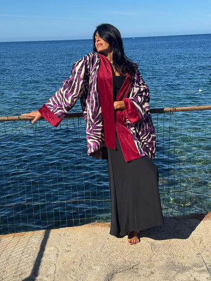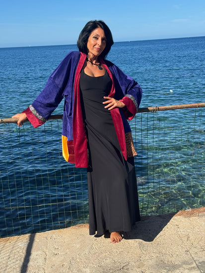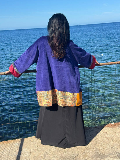 Saphira è una giacca dal carattere prezioso e versatile. Saphira è realizzata in morbido velluto viola intenso, è impreziosita da inserti in seta con motivi geometrici e dettagli in tessuto etnico nei toni dell’oro e del rosso, che ne esaltano il fascino artigianale. La particolarità di Saphira è la reversibilità: può essere indossata sia sul lato vellutato, elegante e raffinato, sia sul lato in seta stampata, più vivace e scenografico. Saphira è un capo trasformista, capace di adattarsi a contesti diversi, dall’atmosfera bohemienne a quella più sofisticata.