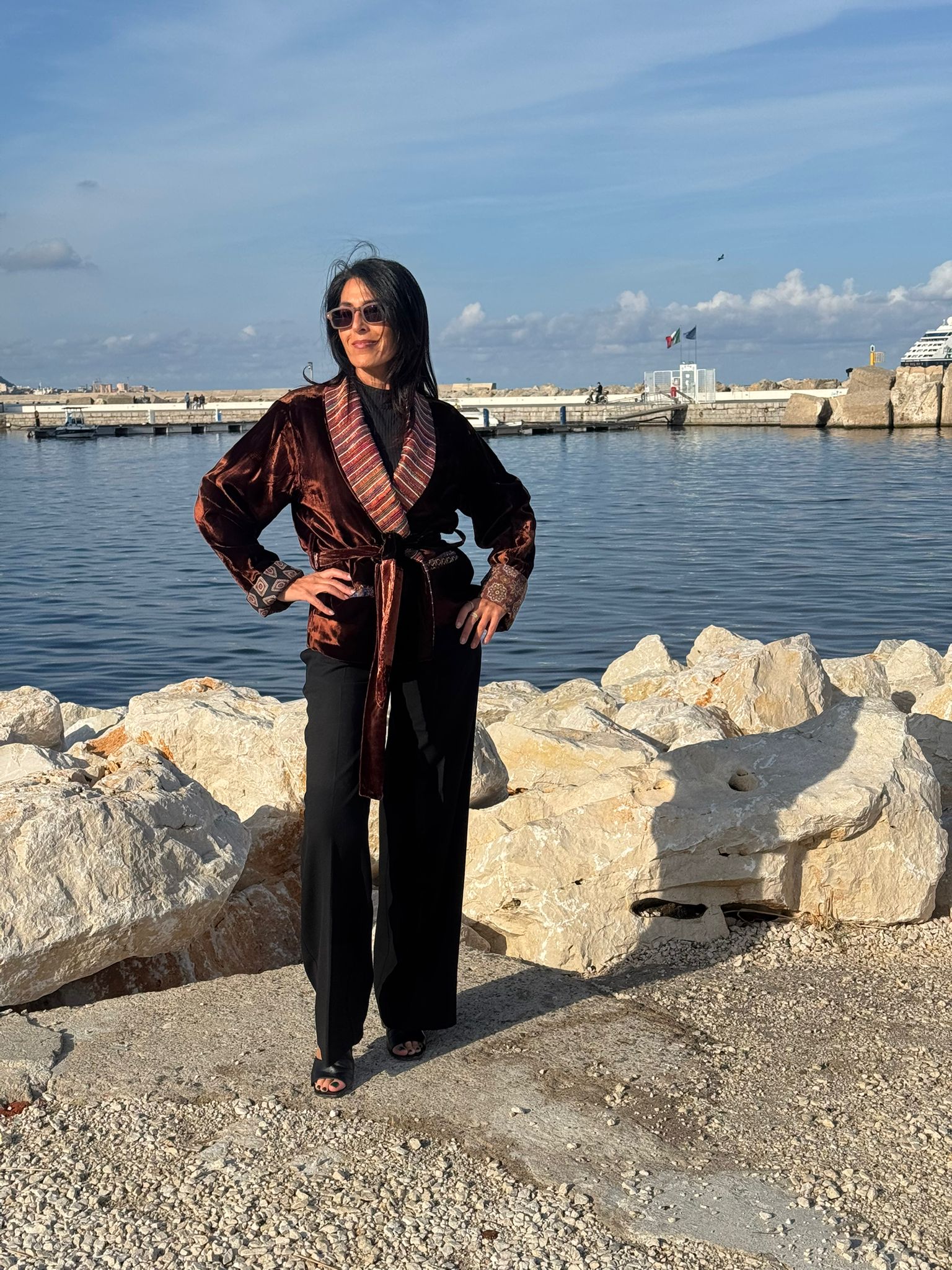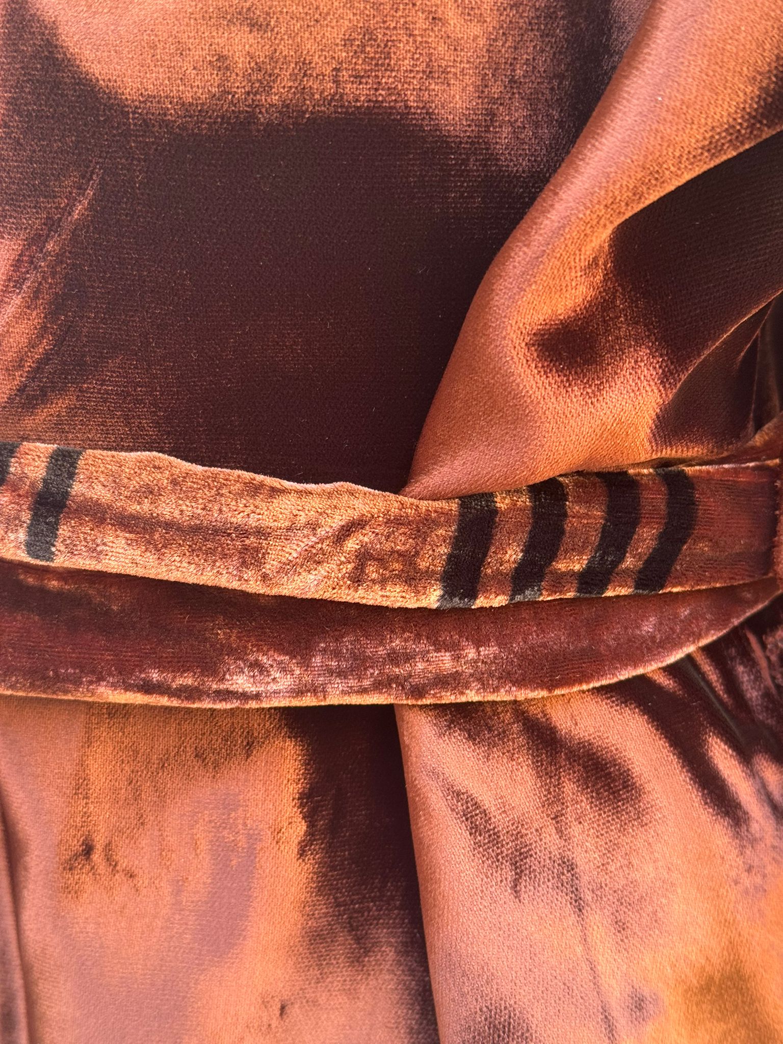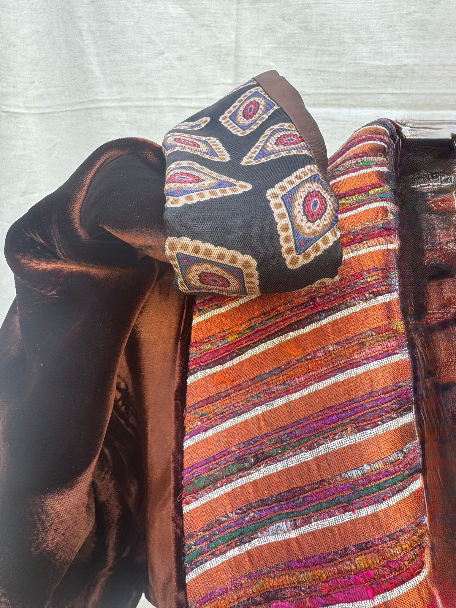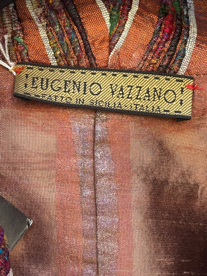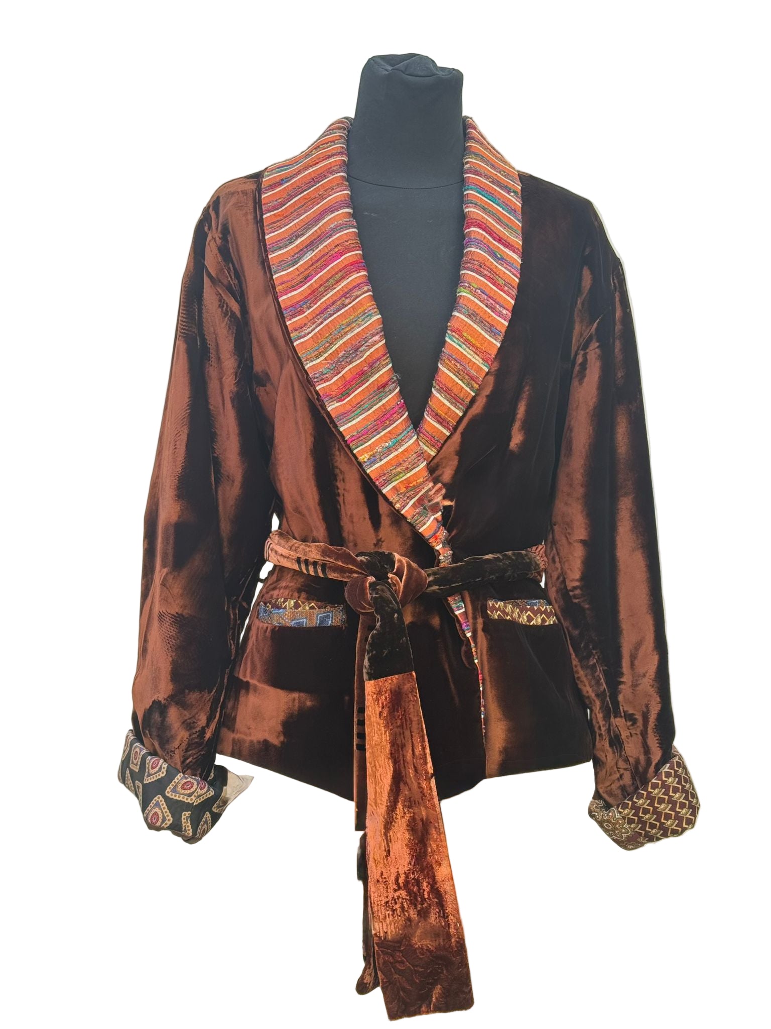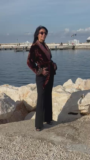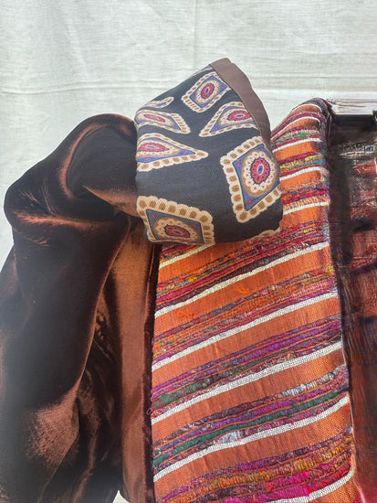 Velvet Manifesto è una giacca che parla con voce propria! Velvet Manifesto è una dichiarazione di stile, sensualità e memoria artigianale. Il corpo in velluto cioccolato sprigiona una luce calda e liquida, cangiante come il bronzo al tramonto. Il bavero e i dettagli interni, in seta rigata multicolor, introducono un controcanto vibrante: toni di rame, malva, arancio e turchese che sfilano in un ritmo irregolare, come un frammento di musica tribale. Le maniche di Velvet Manifesto , con risvolti di ispirazione cravatta, geometrie rétro su fondo scuro, rivelano la cura per il dettaglio del fatto a mano e il gusto per la sorpresa. È un capo che non si indossa: si interpreta.