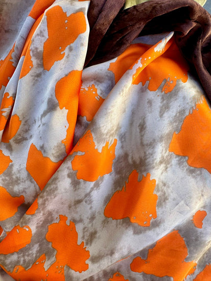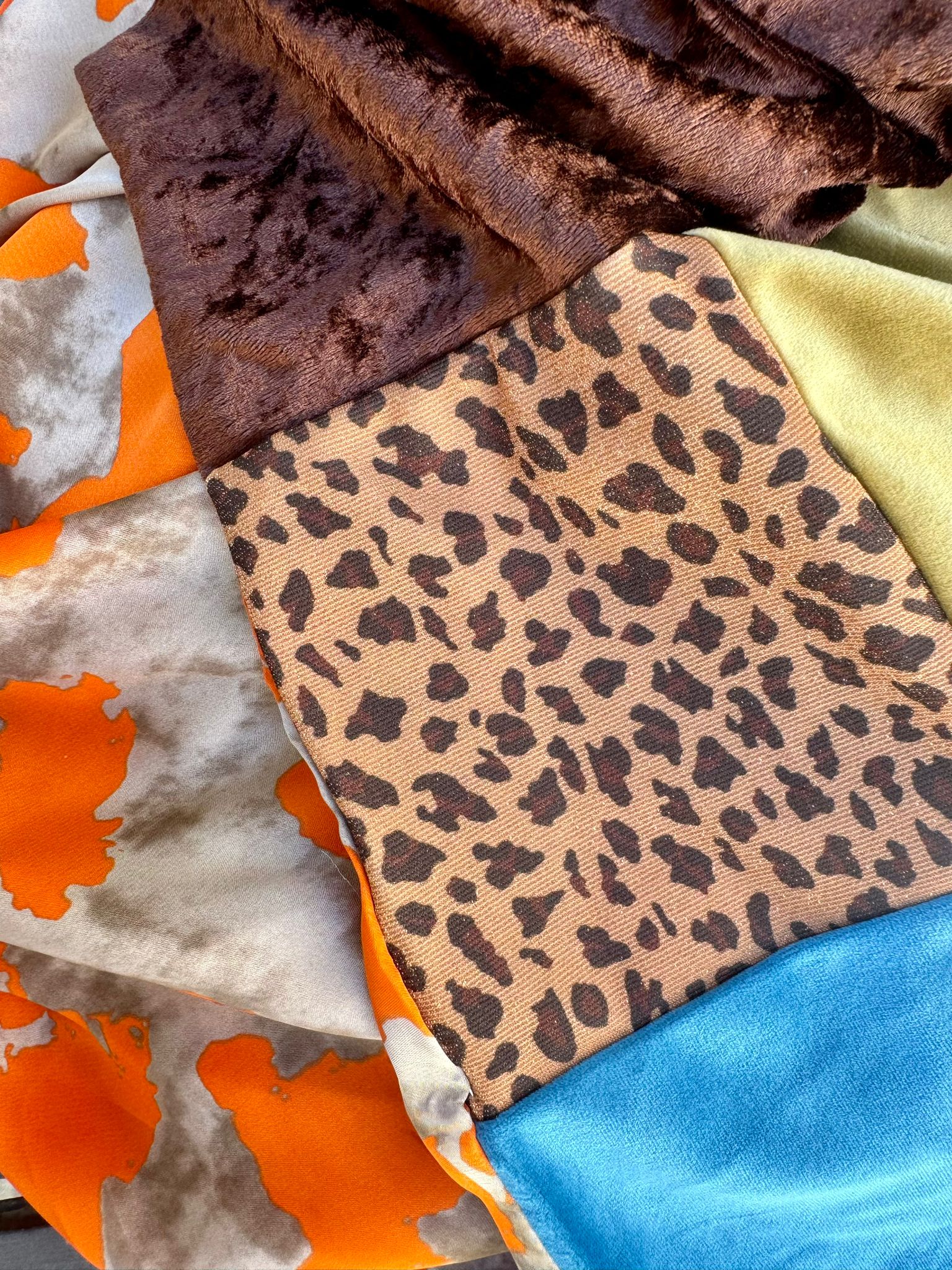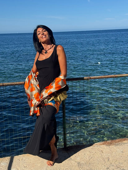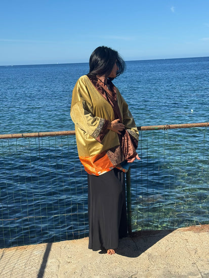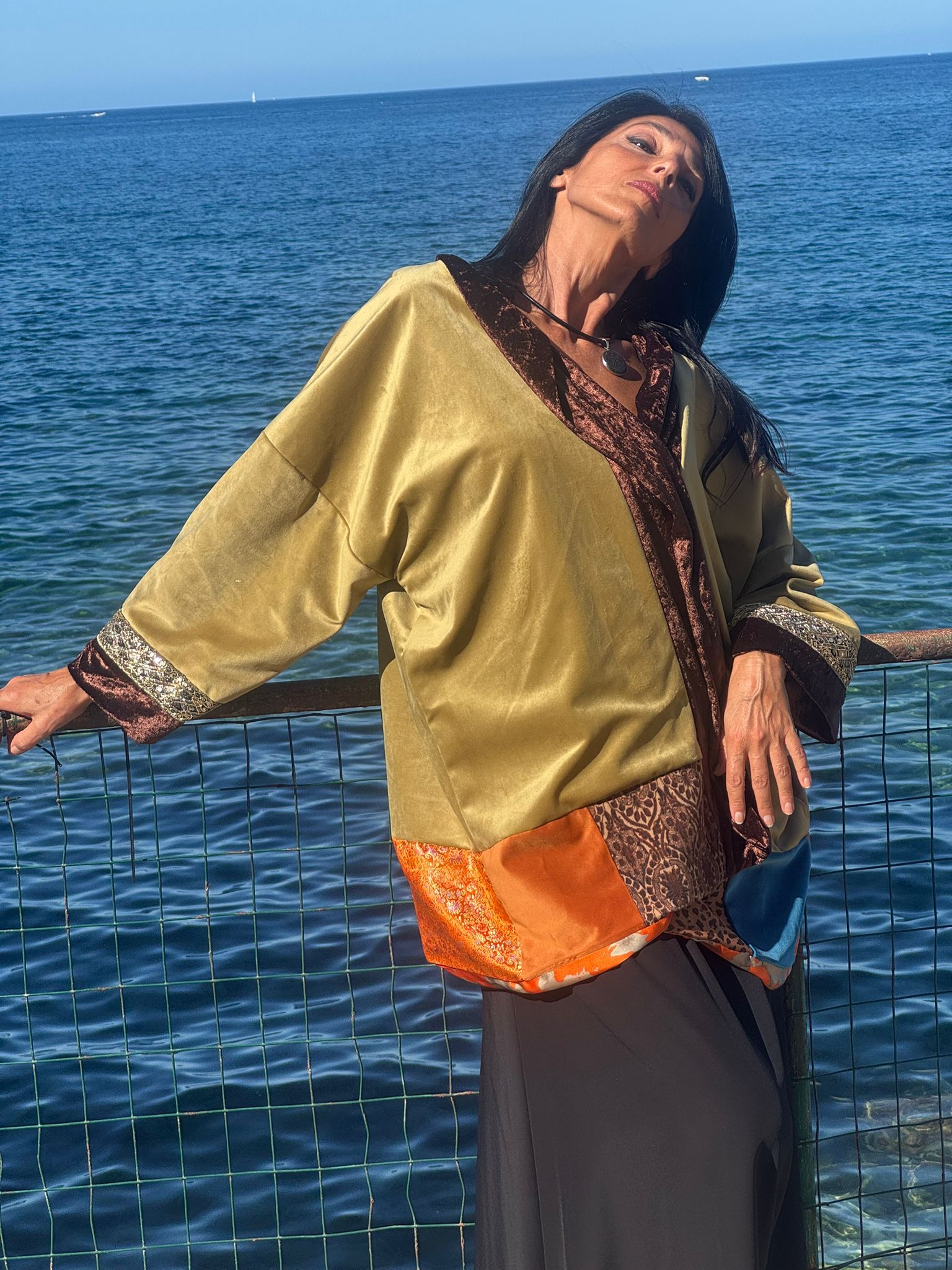 Zahara è una giacca dal fascino solare e camaleontico. Zahara è realizzata in velluto morbido color senape con inserti patchwork nei toni del rame, del blu e del marrone, è impreziosita da dettagli in seta cangiante arancio e argento che la rendono vivace e luminosa. La particolarità di Zahara è la reversibilità: può essere indossata anche dal lato interno, dove il tessuto in seta con grandi fiori arancio su fondo perla trasforma il capo in un’esplosione di colore e leggerezza. Zahara, una giacca con doppia anima: più calda ed elegante sul velluto, più vibrante e scenografica sul lato seta.
