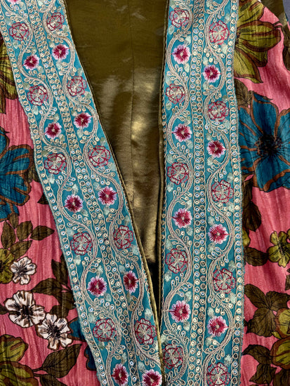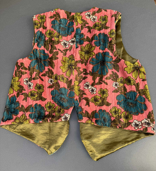 Il Gilet Fiore di Jaipur è un’esplosione di colore e vitalità. Da un lato Fiore di Jaipur , è realizzato in tessuto fiorito nei toni del corallo e del verde oliva con grandi corolle turchesi e dettagli crema, impreziosito da un bordo ricamato in seta turchese e oro che richiama le antiche sete indiane. Dall’altro lato, un raso color bronzo chiaro che riflette la luce con eleganza, donando al capo un aspetto più sobrio e sofisticato.