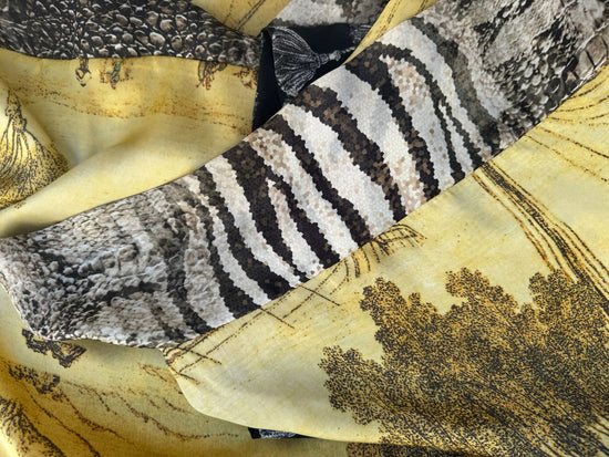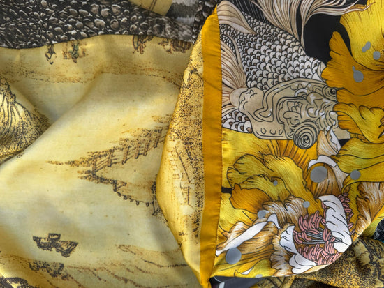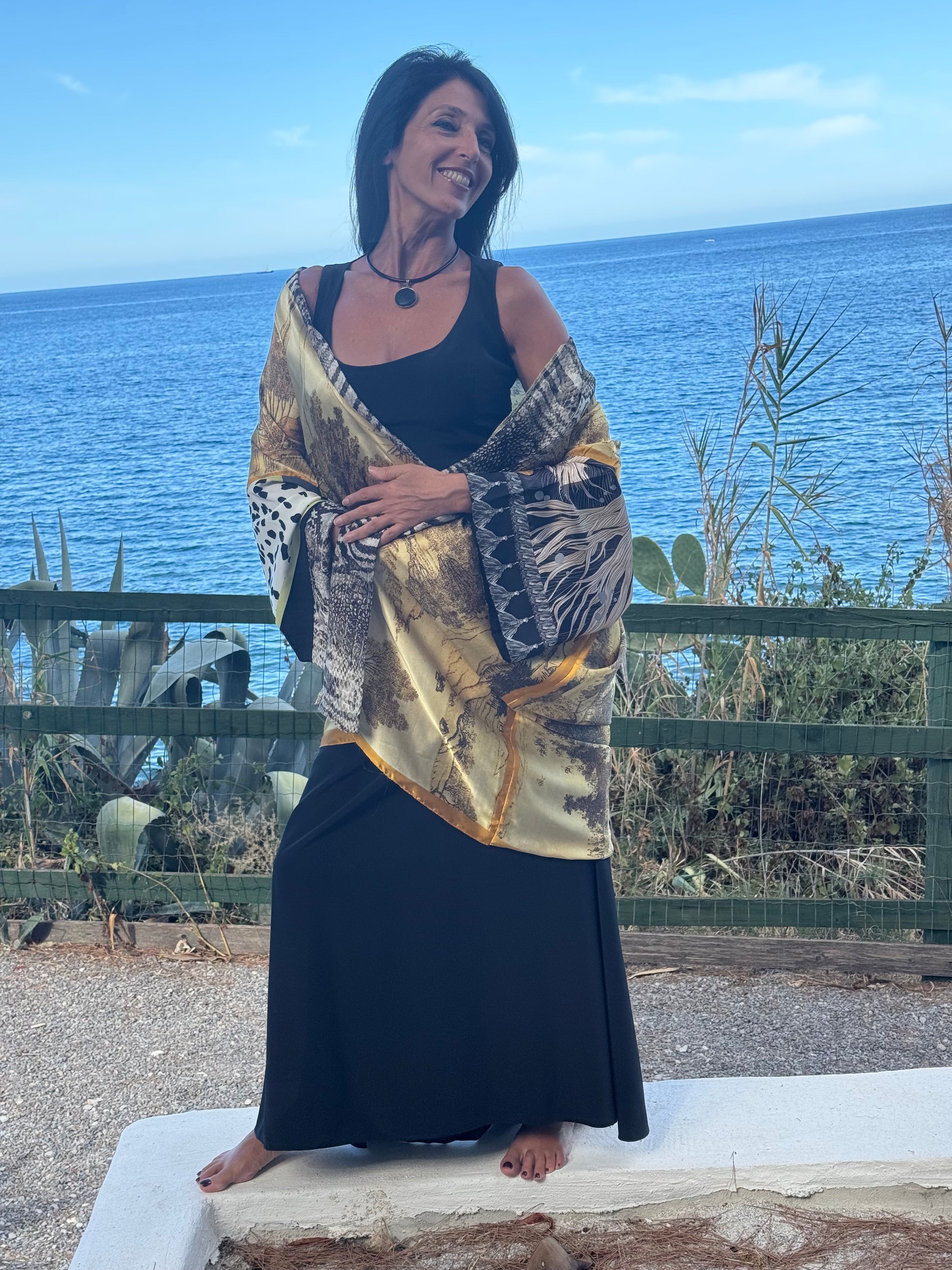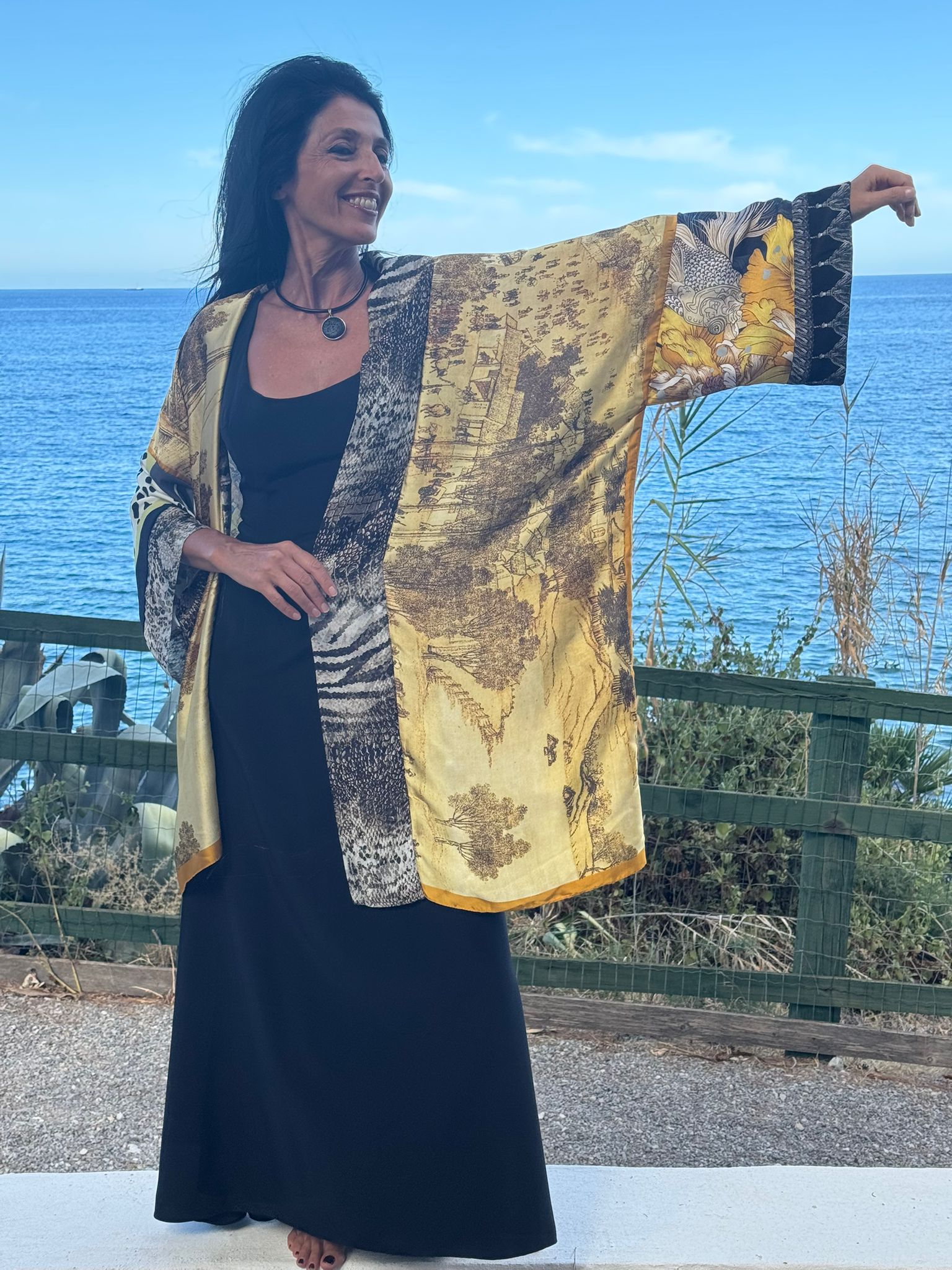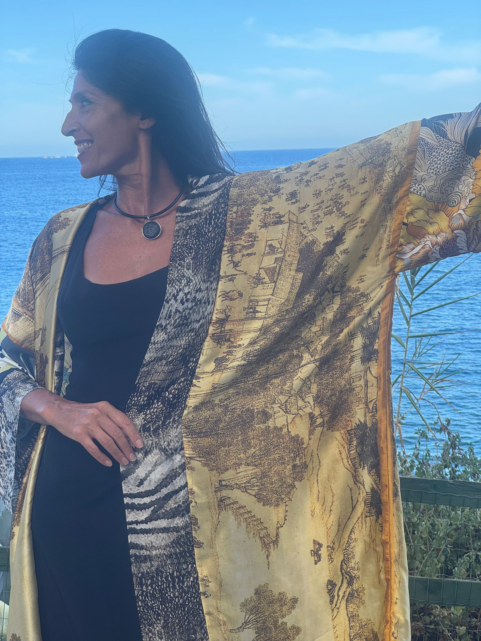 Aurora è un kimono dalla personalità elegante e luminosa. Aurora è realizzato in misto seta con inserti in raso di seta , gioca con tonalità calde di oro e beige che si intrecciano a motivi grafici in nero e bianco, creando un equilibrio sofisticato tra luce e ombra. I dettagli delle maniche e delle bordature, con motivi geometrici e pennellate artistiche, ne accentuano il carattere cosmopolita e raffinato. Aurora è un capo che sprigiona fascino naturale e un tocco di mistero, come un paesaggio dorato al sorgere del sole.