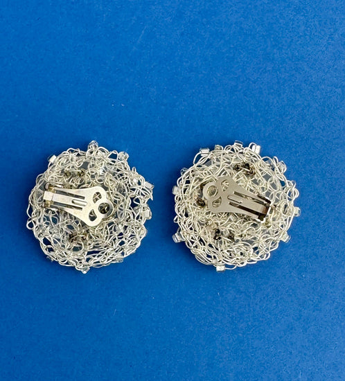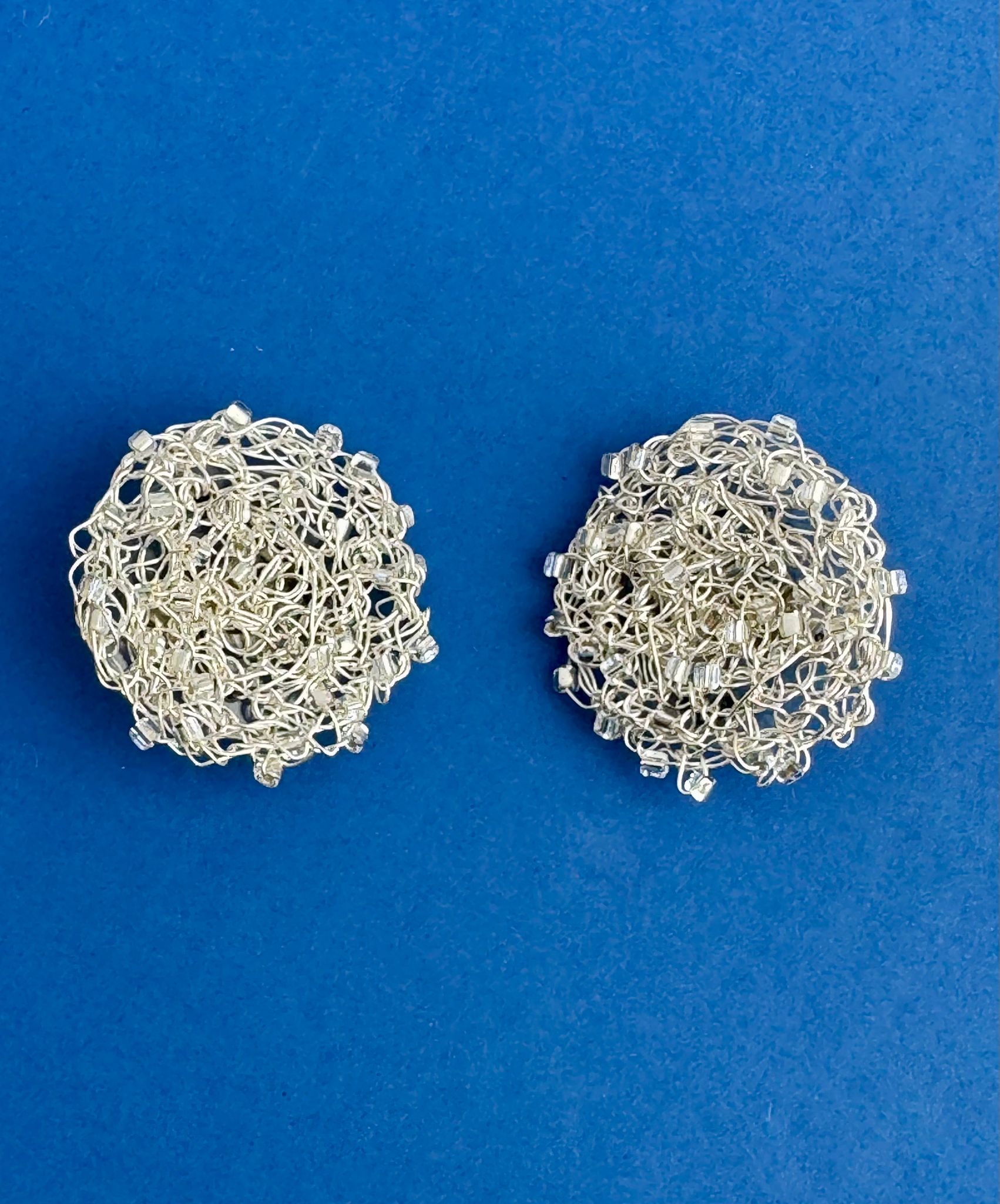 Gomitolo Argento sono orecchini a bottone dalla struttura che richiama un piccolo gomitolo di lana, ottenuto avvolgendo disordinatamente il filo d'argento per creare una forma circolare o a cupola dalla texture ariosa e tridimensionale.