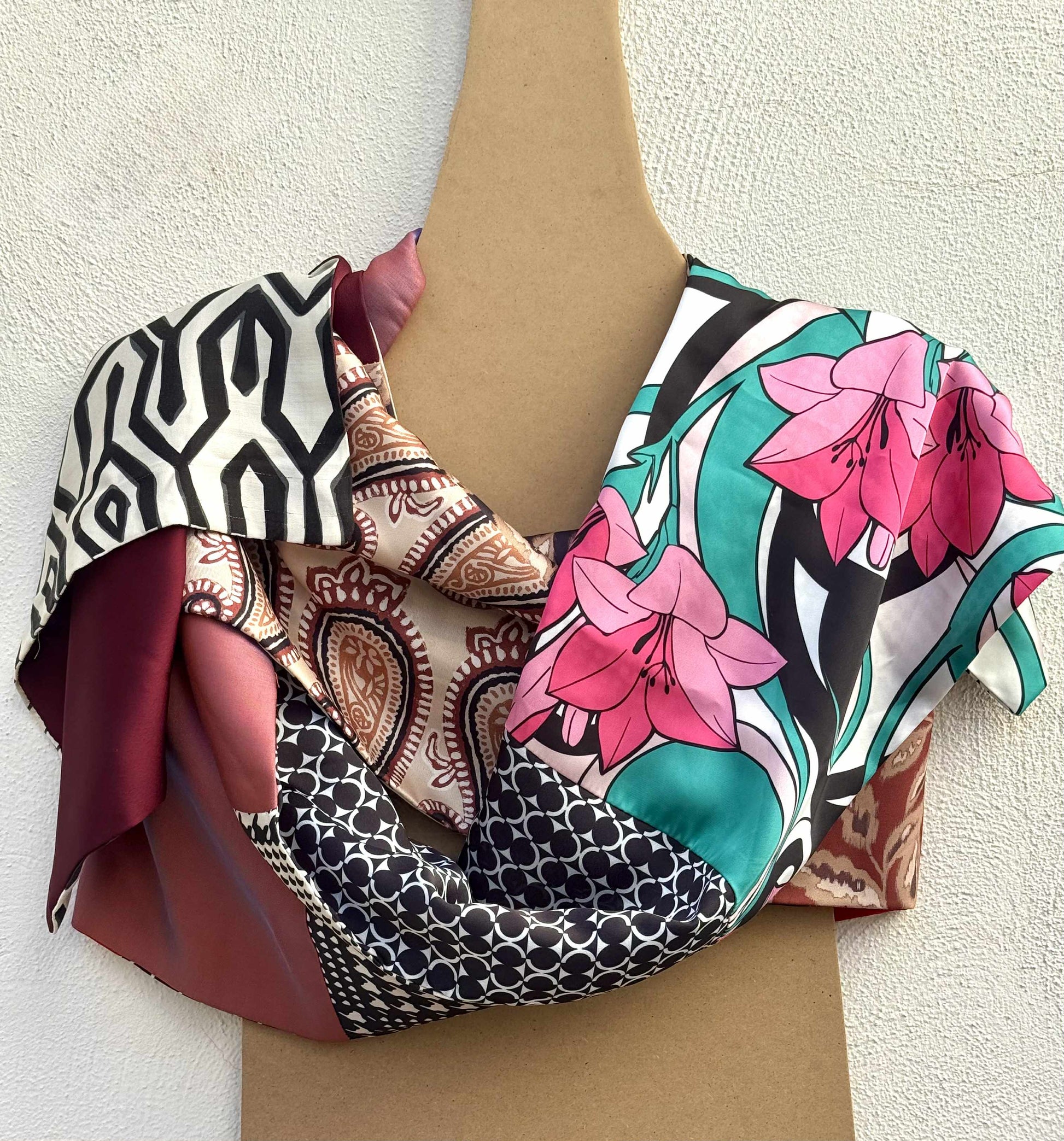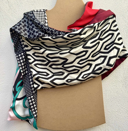 La sciarpa Aurora Rosso Urbano nasce dall’incontro tra grafismi contemporanei e suggestioni etniche. Il patchwork di Aurora Rosso Urbano intreccia motivi geometrici optical in bianco e nero con elementi floreali stilizzati nei toni del fucsia e del verde smeraldo, mentre inserti paisley e trame vegetali richiamano atmosfere più calde e terrose.