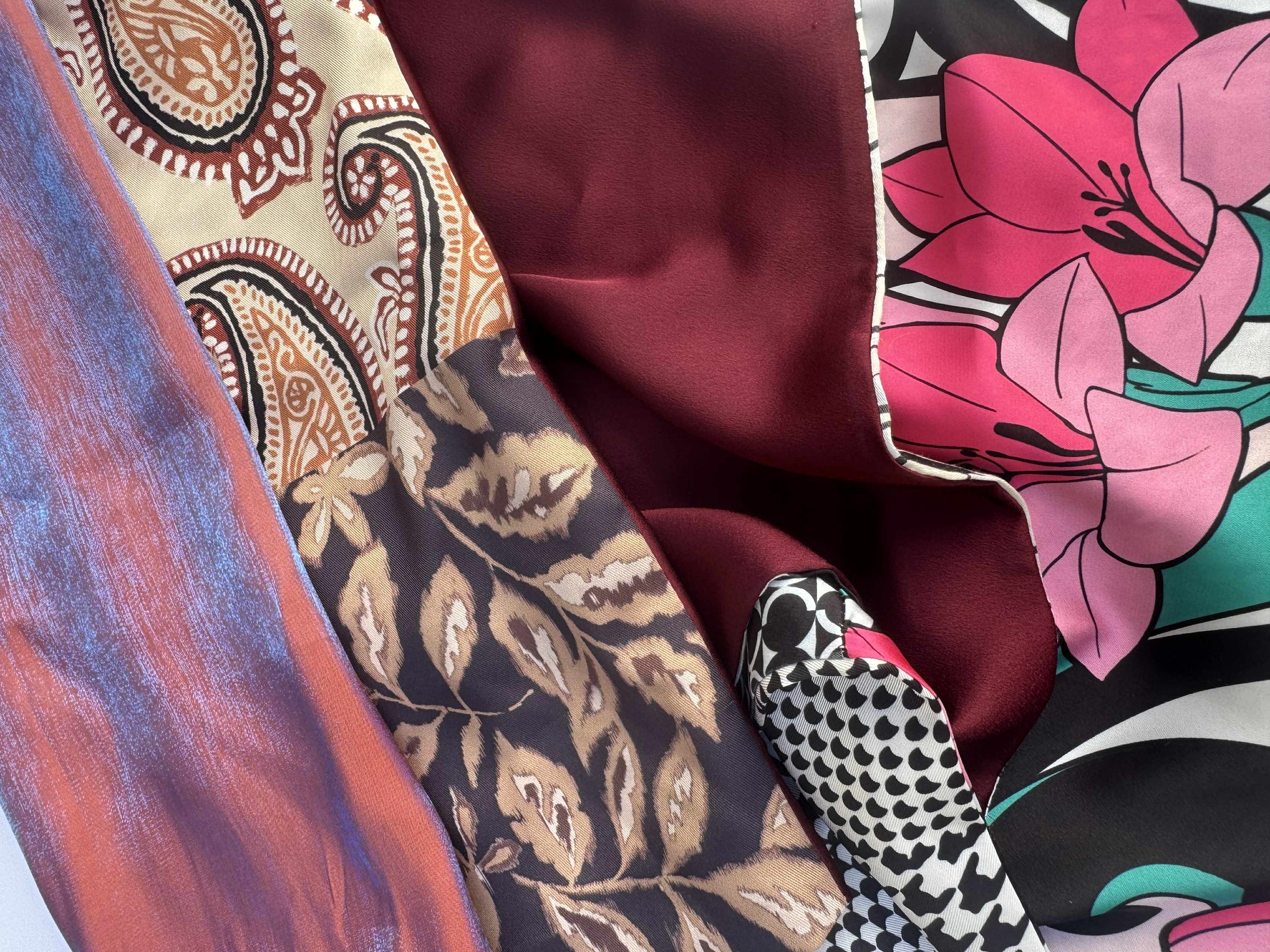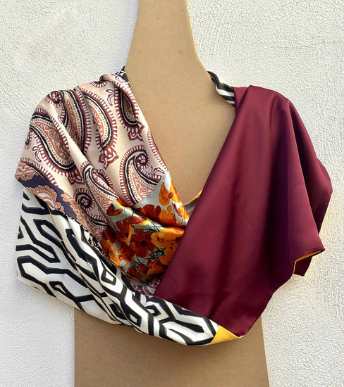 Aurora Rosso Urbano misura circa 200 x 40 cm, lavorata artigianalmente con inserti in raso di seta, viscosa e microfibra lucida. Le cuciture di Aurora Rosso Urbano sono piatte e pulite, con orlo sottile a mano che garantisce una caduta fluida e una piacevole sensazione sulla pelle. La struttura patchwork, pur leggera, dona corpo e movimento, rendendola perfetta per ogni stagione.