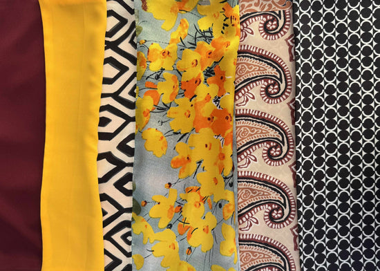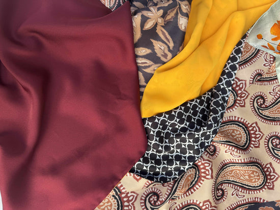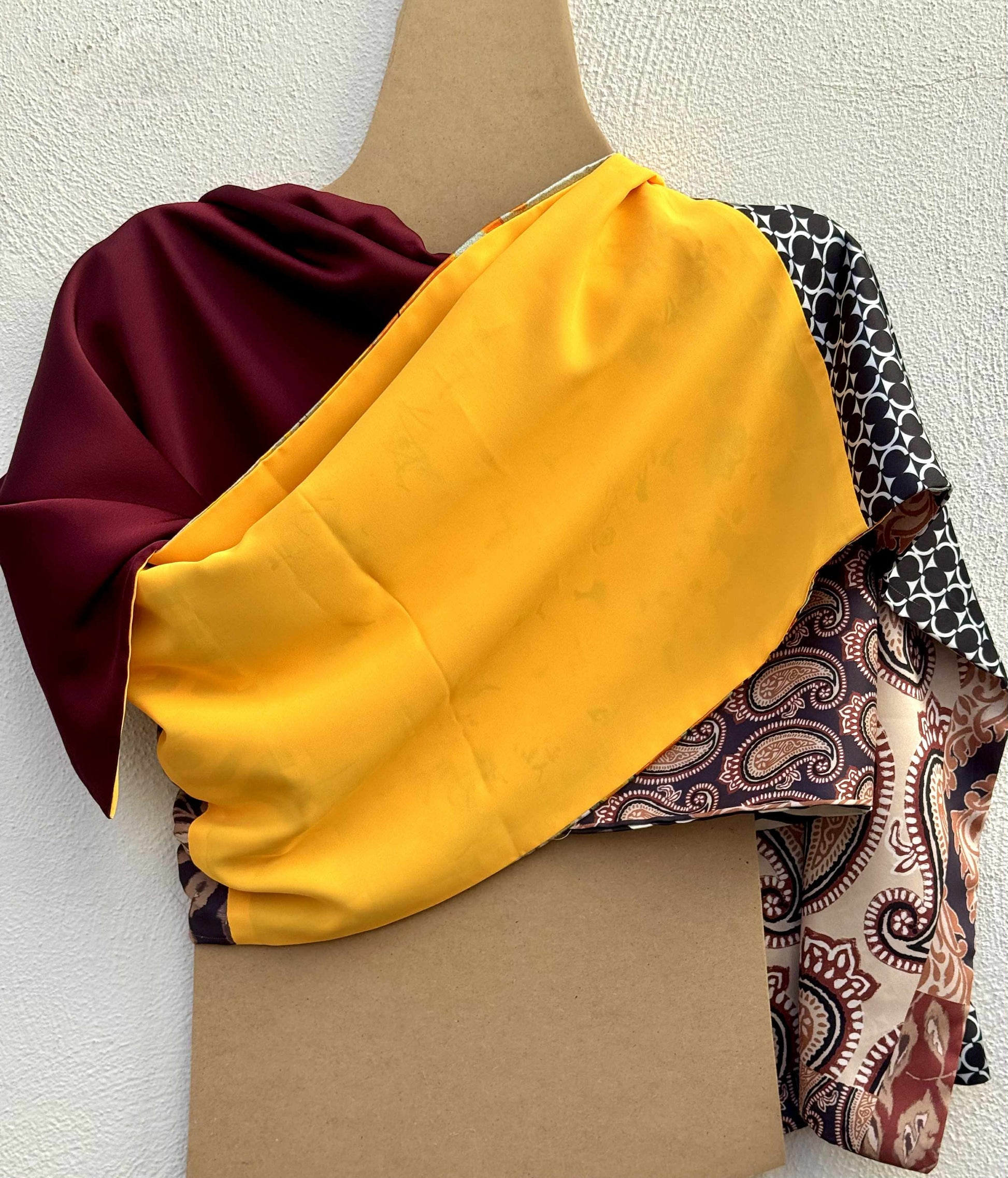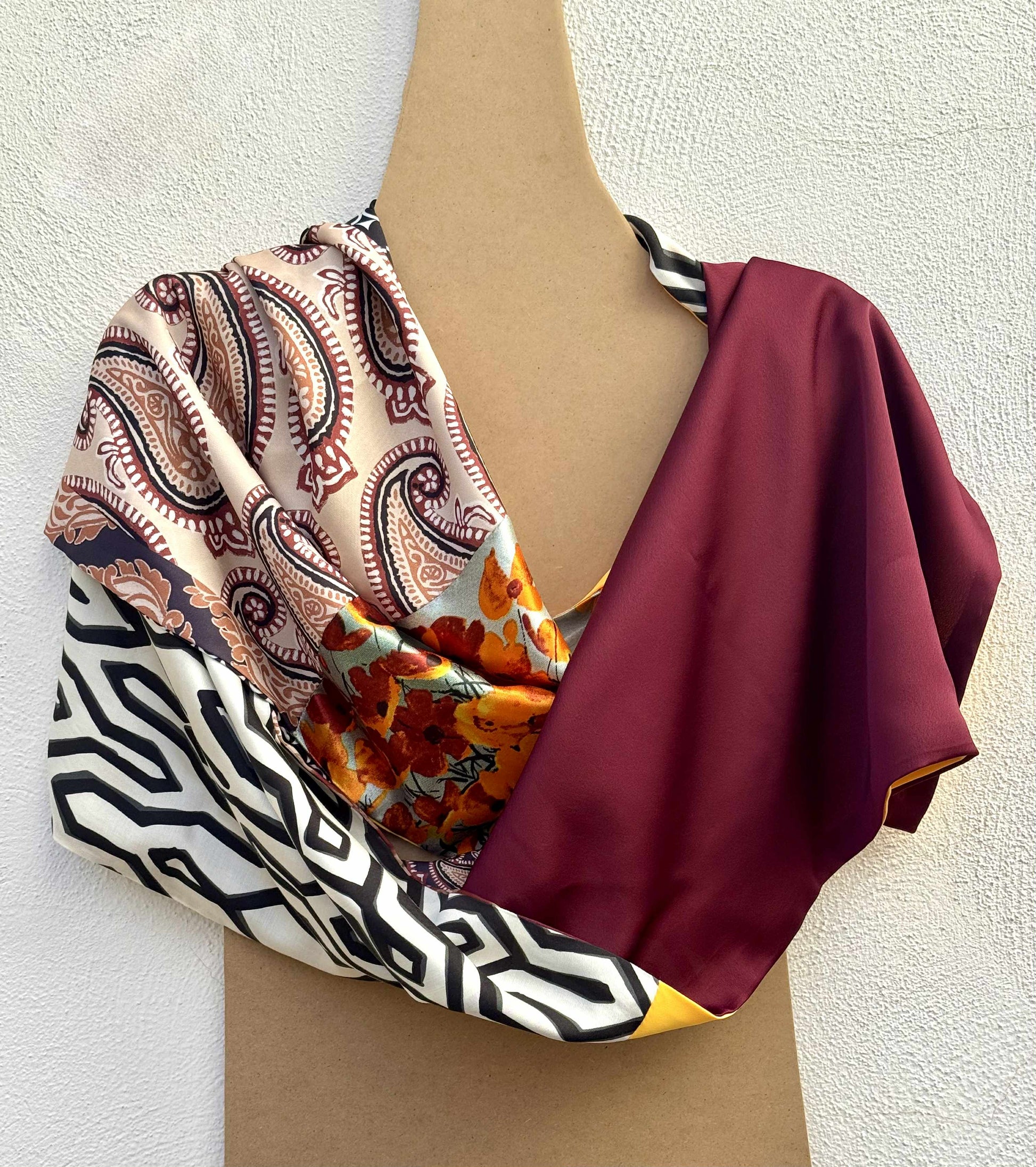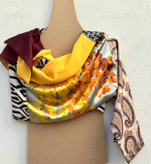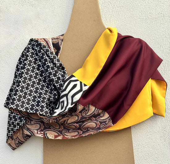 Ogni tessuto di Aurora Sole di Maggioporta con sé un’eco diversa: la geometria urbana, la tradizione orientale, la delicatezza del fiore di campo. Insieme, danno vita a un patchwork che sprigiona vitalità e carattere, come un tramonto estivo catturato nella seta. È una sciarpa che parla di energia e passione, con un’eleganza decisa e solare.
