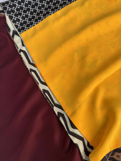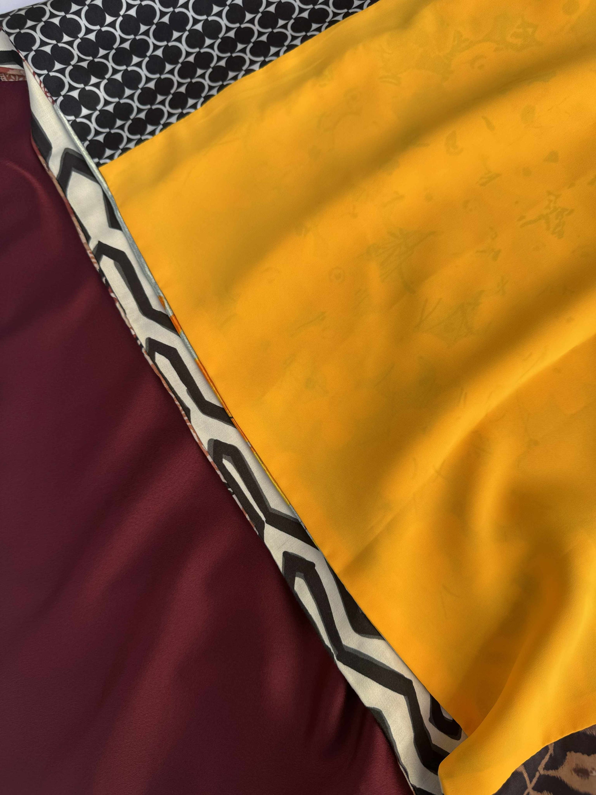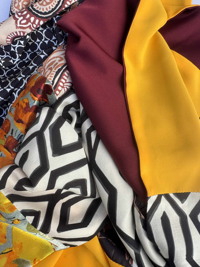 La sciarpa Aurora Sole di Maggio è una celebrazione della luce e del colore. I pannelli di Aurora Sole di Maggio alternano il giallo zafferano e il bordeaux profondo a motivi grafici optical in bianco e nero, arabeschi paisley color rame e stampe floreali nei toni caldi dell’arancio e dell’oro.
