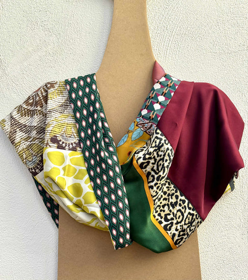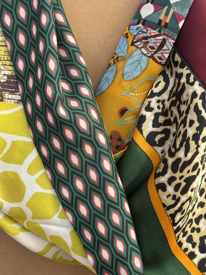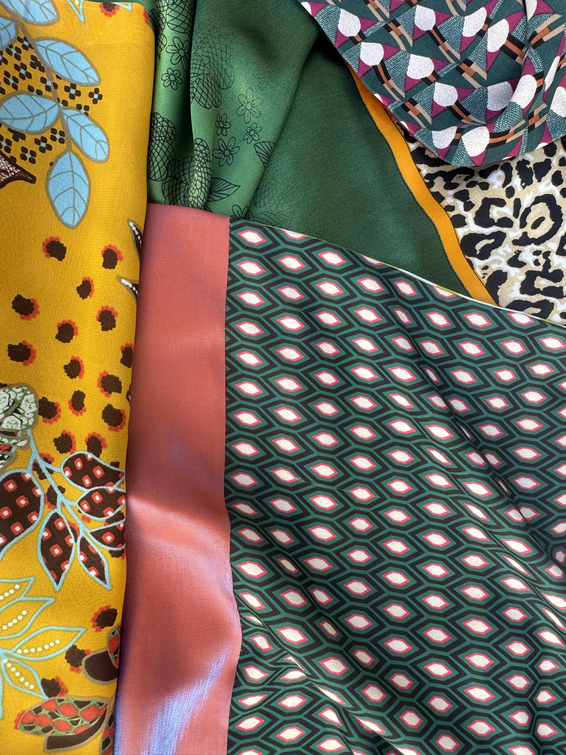 La Sciarpa Aurora Verde Cangiante è un patchwork di tessuti pregiati che si intrecciano in un equilibrio tra lucentezza e profondità cromatica. I verdi dominano la composizione di Aurora Verde Cangiante : dal giada al bosco, fino al lime satinato che cattura la luce. Accanto, geometrie rétro nei toni del rosa cipria e dell’avorio dialogano con stampe organiche e pennellate astratte color sabbia e caffè. Ogni sezione di Aurora Verde Cangiante racconta un frammento di viaggio tessile: pattern vintage, rasi fluidi, sete lucide e trame materiche che si incontrano in una composizione armoniosa e raffinata.