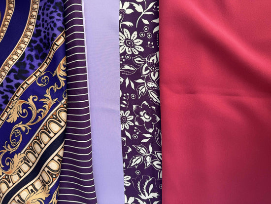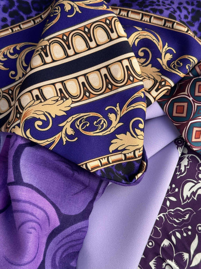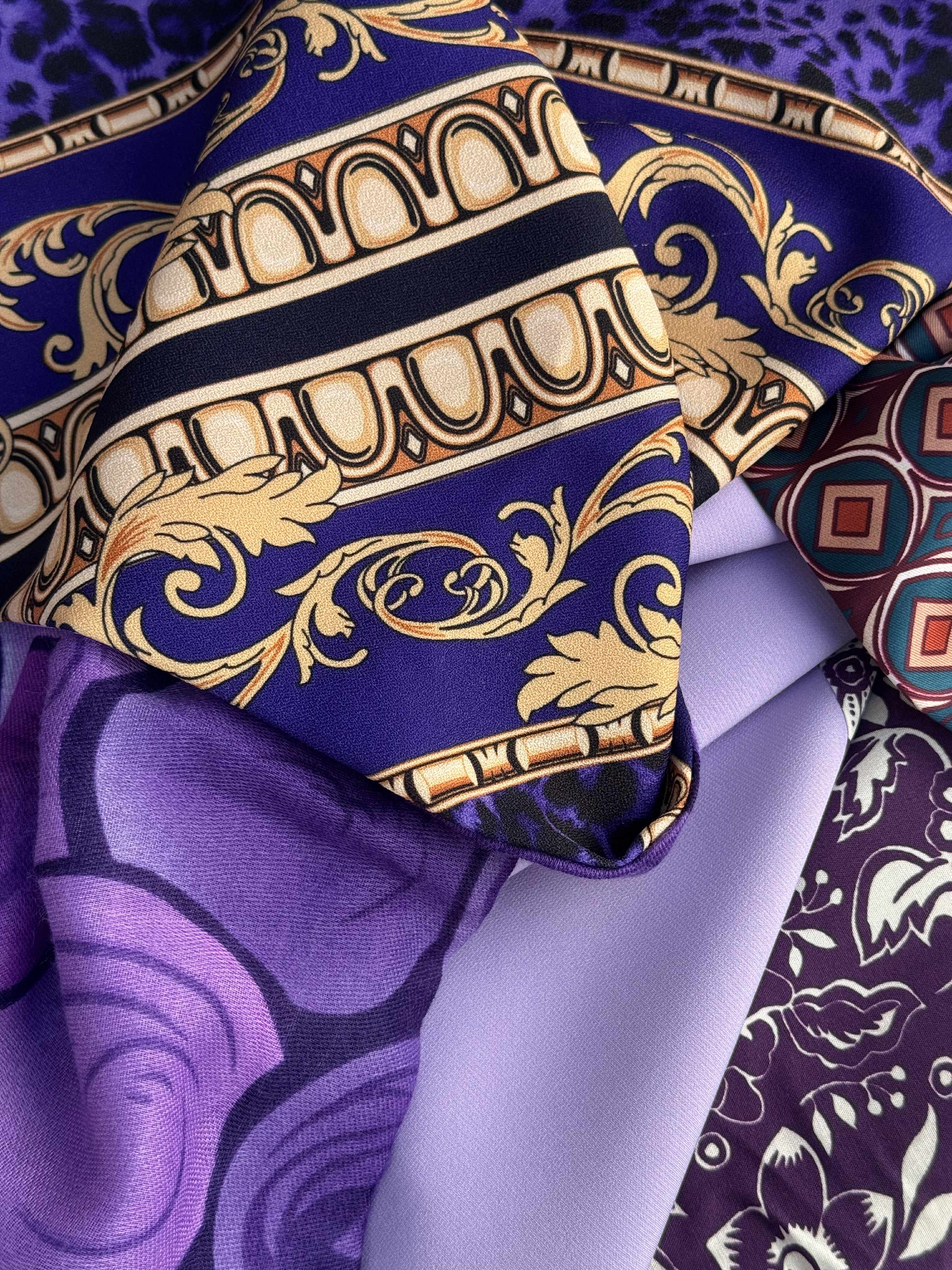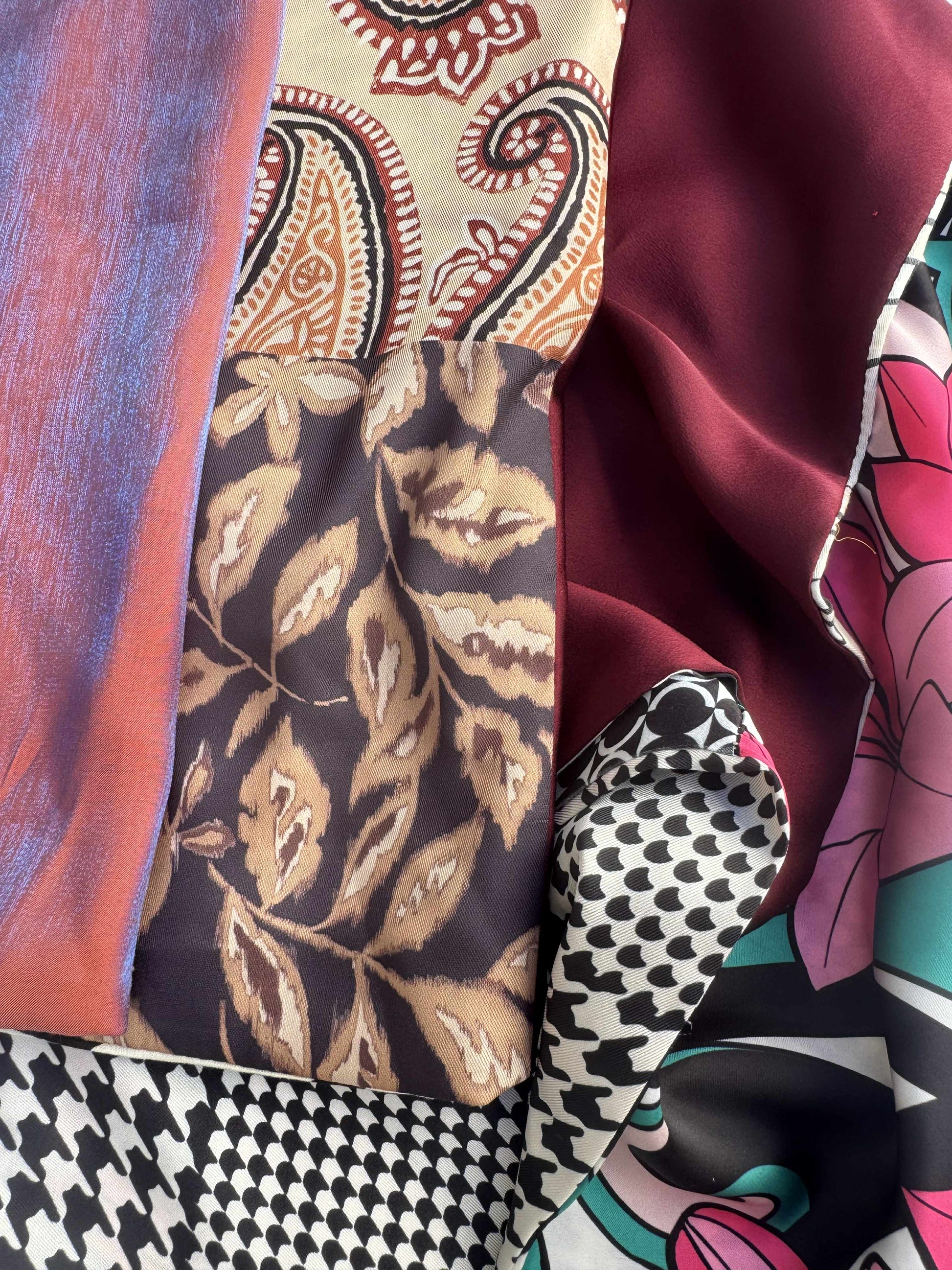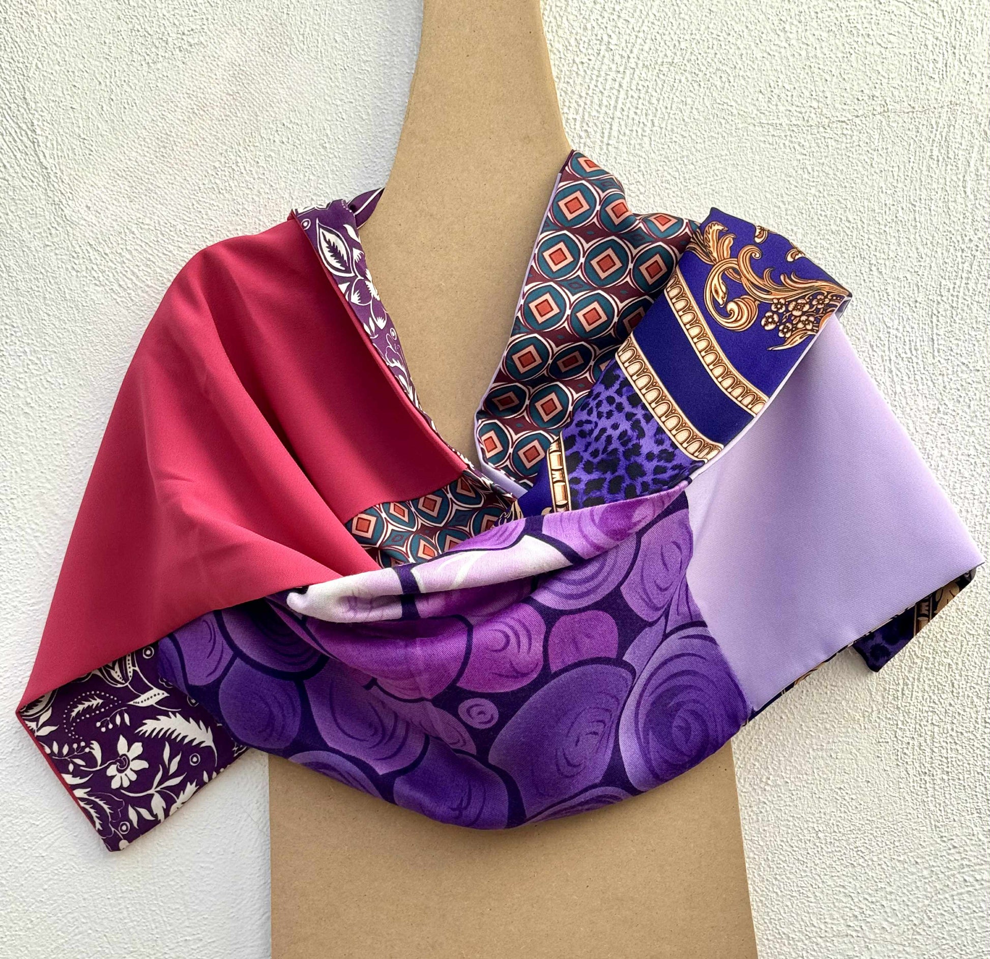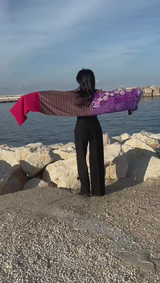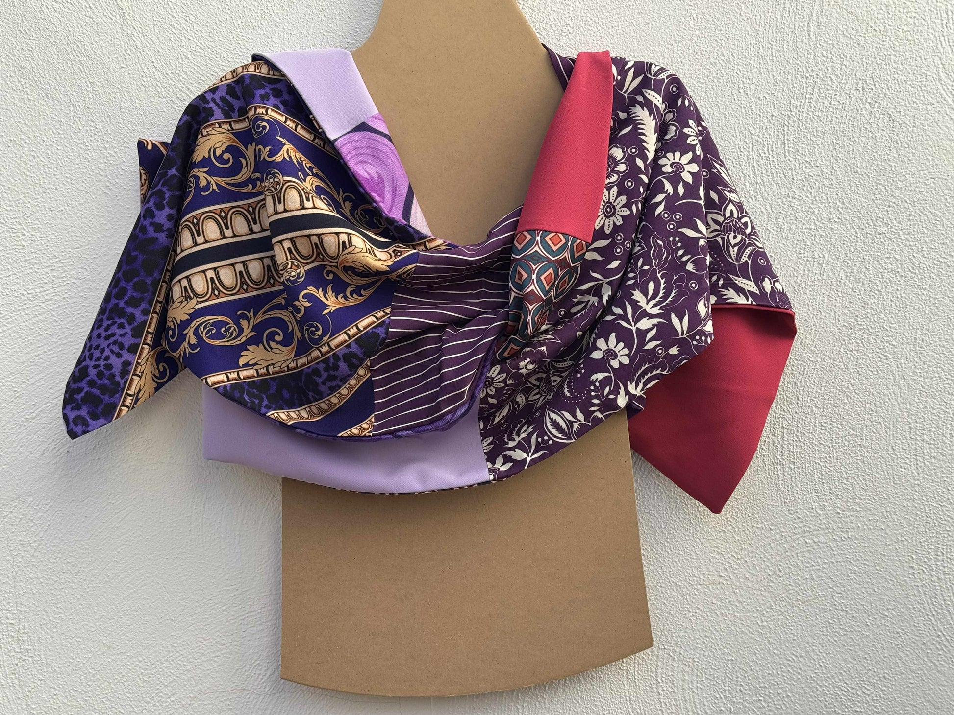 La Sciarpa Aurora Viola Imperiale è un patchwork di eleganza e carattere. Le sfumature di Aurora Viola Imperiale oscillano tra il porpora, il fucsia e il viola ametista, accese da dettagli oro e motivi geometrici bordeaux e turchesi.