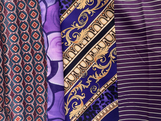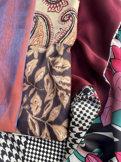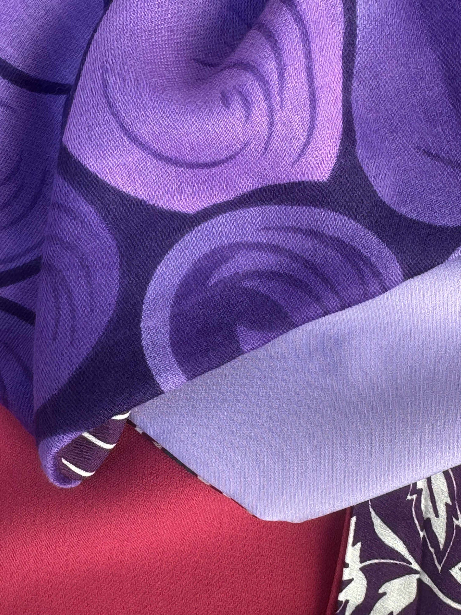 Aurora Viola Imperiale misura circa 200x40 cm, realizzata artigianalmente in seta, viscosa e satin misto microfibra. Ogni sezione è cucita con finiture sartoriali a mano, pensate per unire fluidità e resistenza. Le superfici lisce e setose di Aurora Viola Imperiale riflettono la luce in modo cangiante, mentre i tessuti più opachi donano profondità e contrasto.