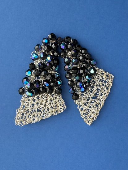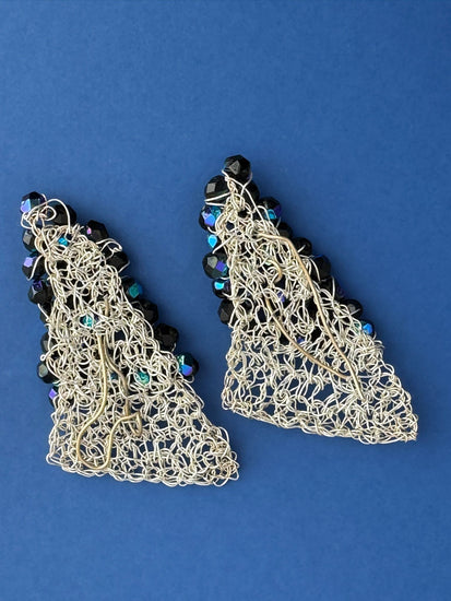 Gli orecchini Frattura hanno forma triangolare. La parte inferiore di Frattura è costituita da una fitta trama di filo metallico argentato, lavorato a maglia o all'uncinetto, che crea una rete leggera ma strutturata.