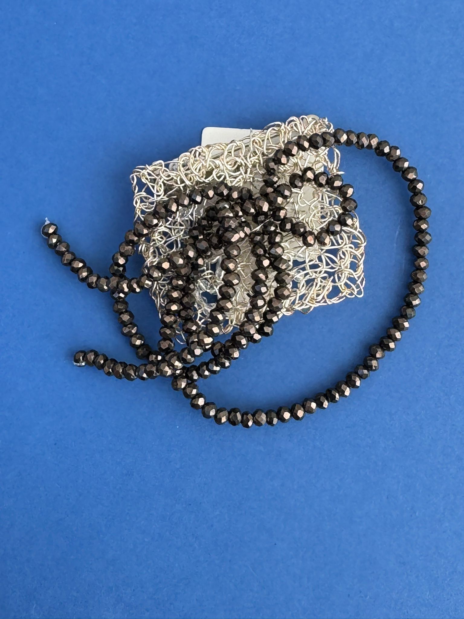 Metallica è un pezzo avanguardista e materico. La lucentezza metallica delle perline nere, unita alla struttura a rete d'argento, le conferisce un'aria sofisticata ma decisa, quasi industrial chic.