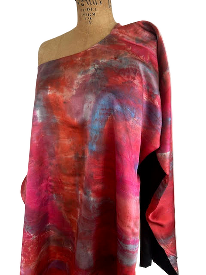 Contrasti di Colore: Indossa Aurora con la fodera in raso di seta all'esterno su un outfit neutro. I motivi astratti aggiungono un tocco di colore e di luce al tuo look.