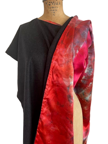 Immagina di indossare un pezzo di lusso e raffinatezza. Aurora è una cappa/poncho realizzata in vigogna double face, foderata in raso di pura seta dipinta a mano con motivi unici e esclusivi.