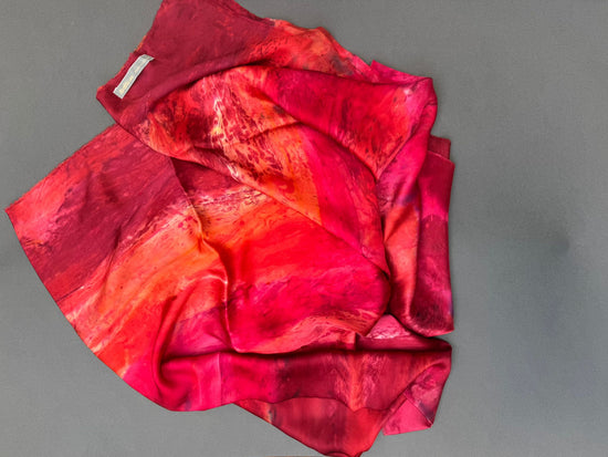 La stola Melograno è double face ed in crepe satin, orlata a mano (100% seta). Dimensioni 210 × 90 cm