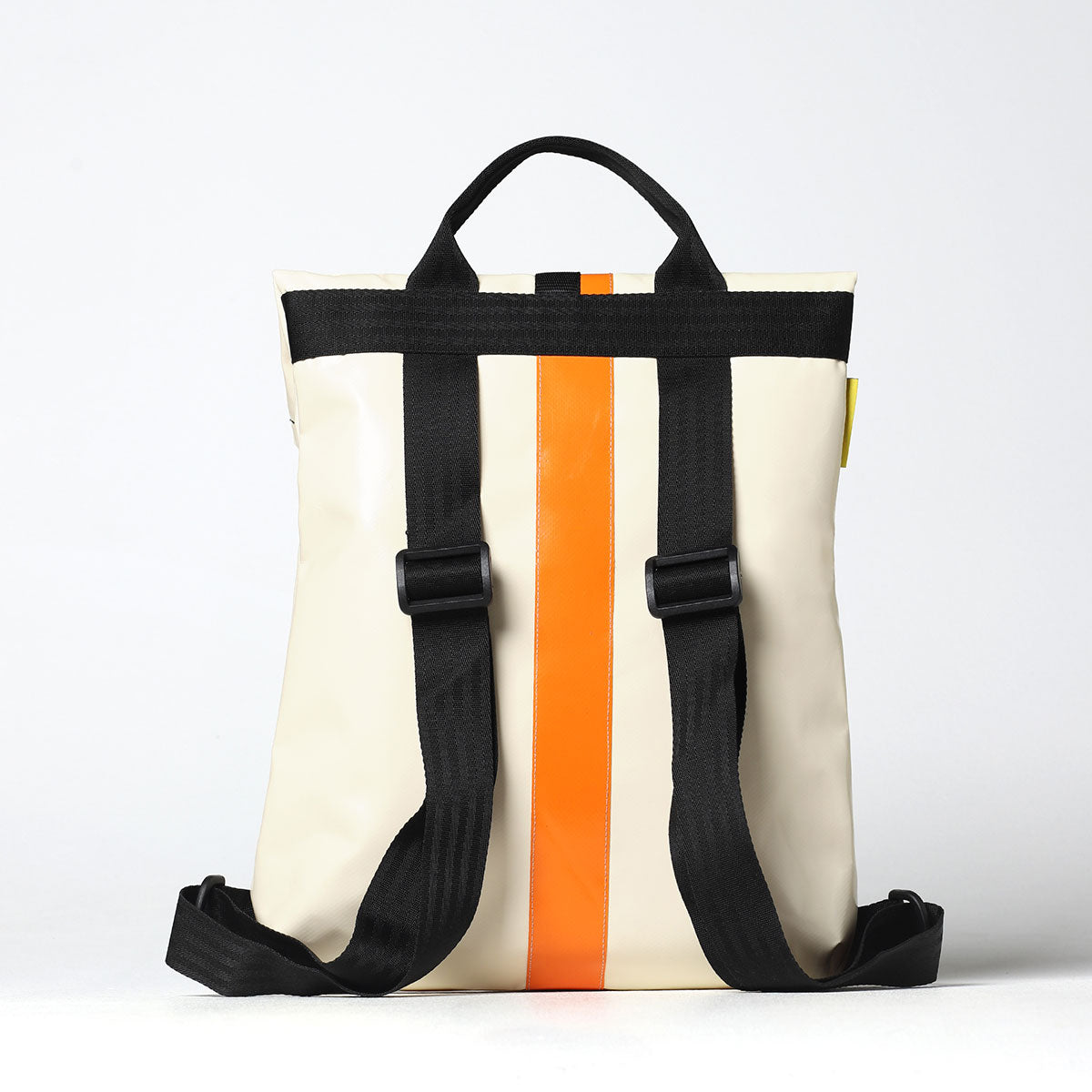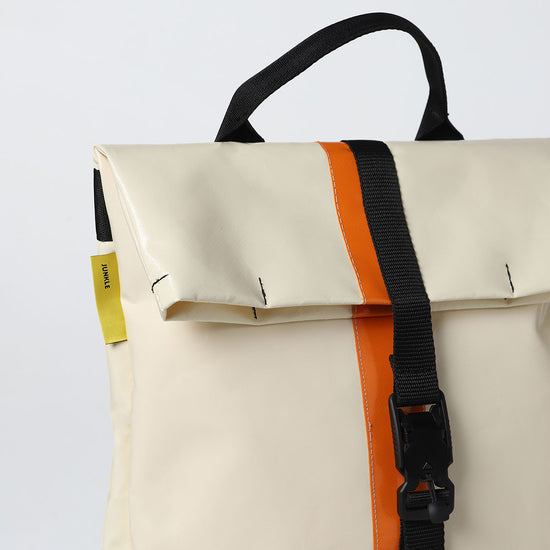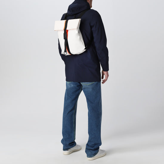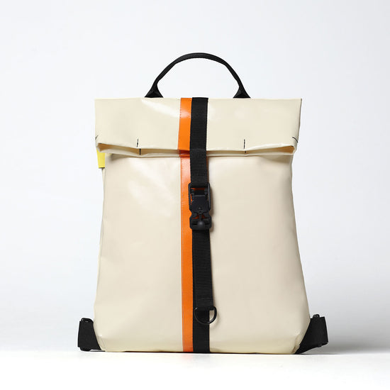 Zaino urban-proof, della collezione VINYL. ALLEY E' Realizzato con scarti di PVC, tasca interna con chiusura a velcro, manico per portarlo a borsa, spallacci e cinghie regolabili e comoda chiusura a calamita Fidlock®.