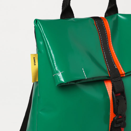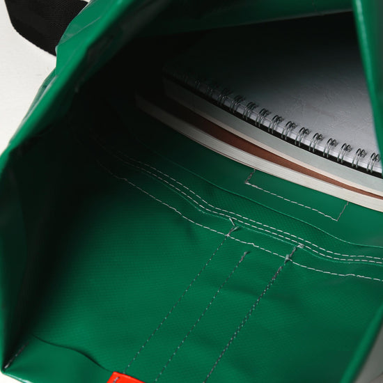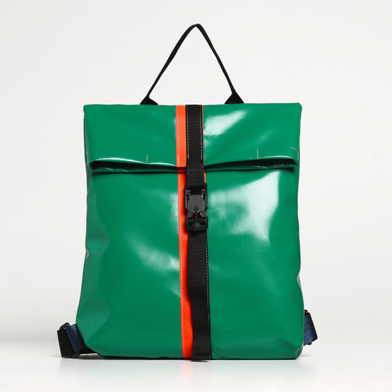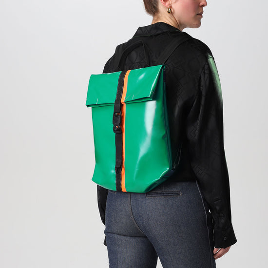 Zaino urban-proof, della collezione VINYL. ALLEY E' Realizzato con scarti di PVC, tasca interna con chiusura a velcro, manico per portarlo a borsa, spallacci e cinghie regolabili e comoda chiusura a calamita Fidlock®.