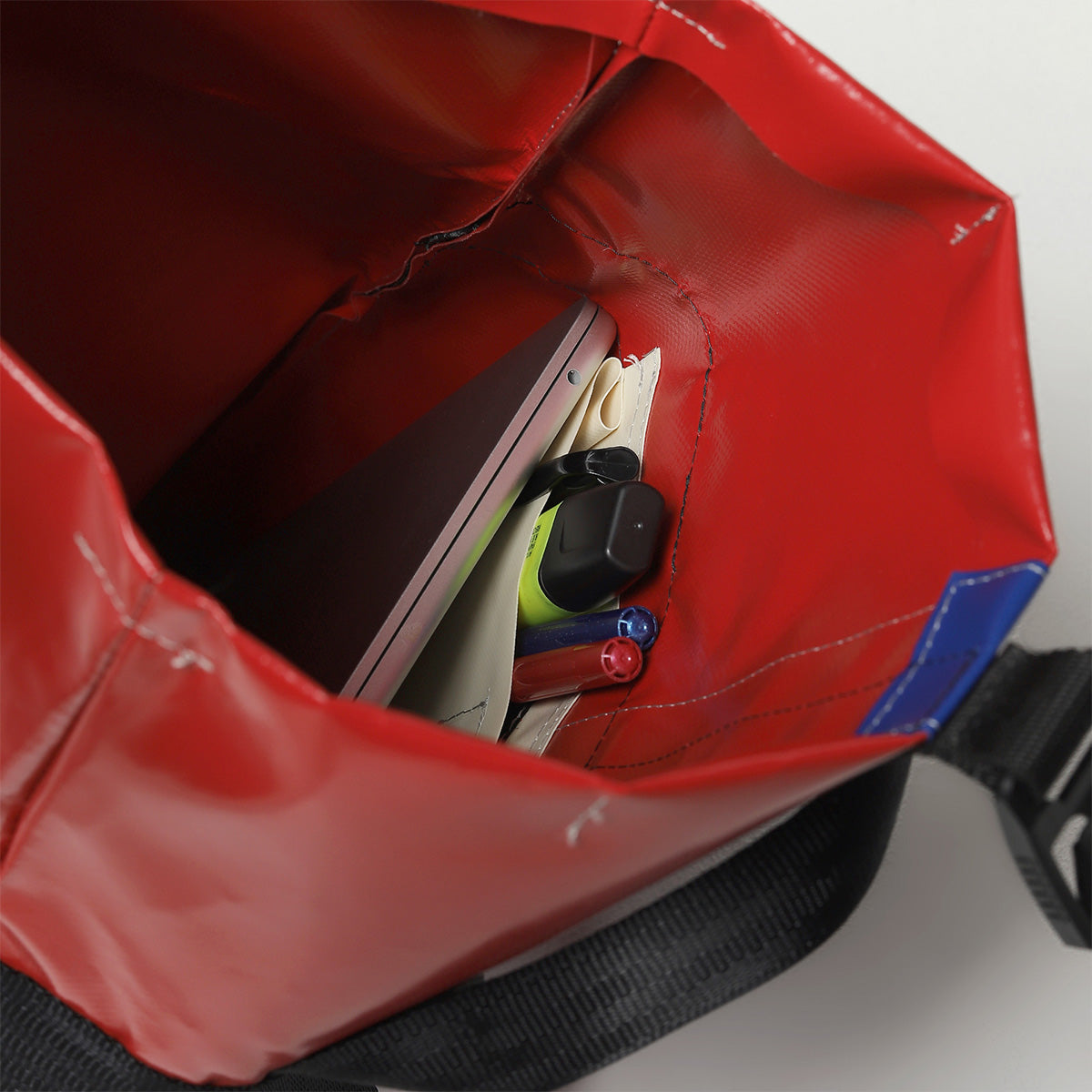 Questo prodotto è stato realizzato con vele usate che hanno attraversato il Mar Mediterraneo e il Mare del Nord, recuperate presso armatori, velisti e velerie.